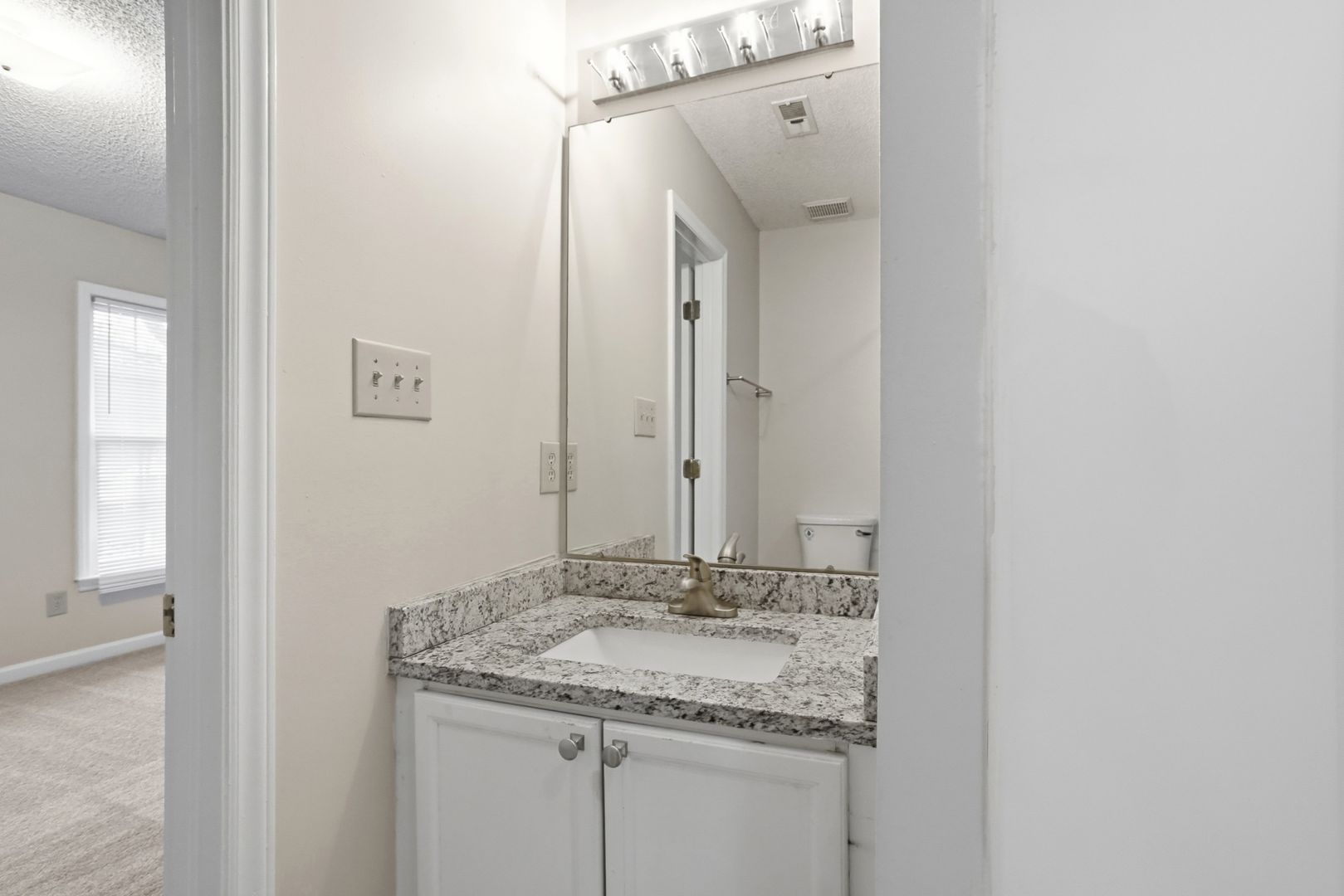 Upstairs, the split-bedroom floor plan offers two generously sized bedrooms, each with its own en suite bath and ample closet space. Both bathrooms have been upgraded with granite vanities and modern fixtures for a sleek, contemporary feel.