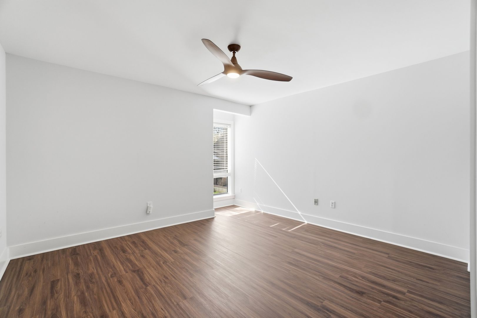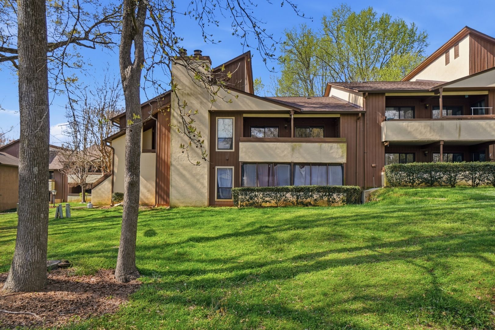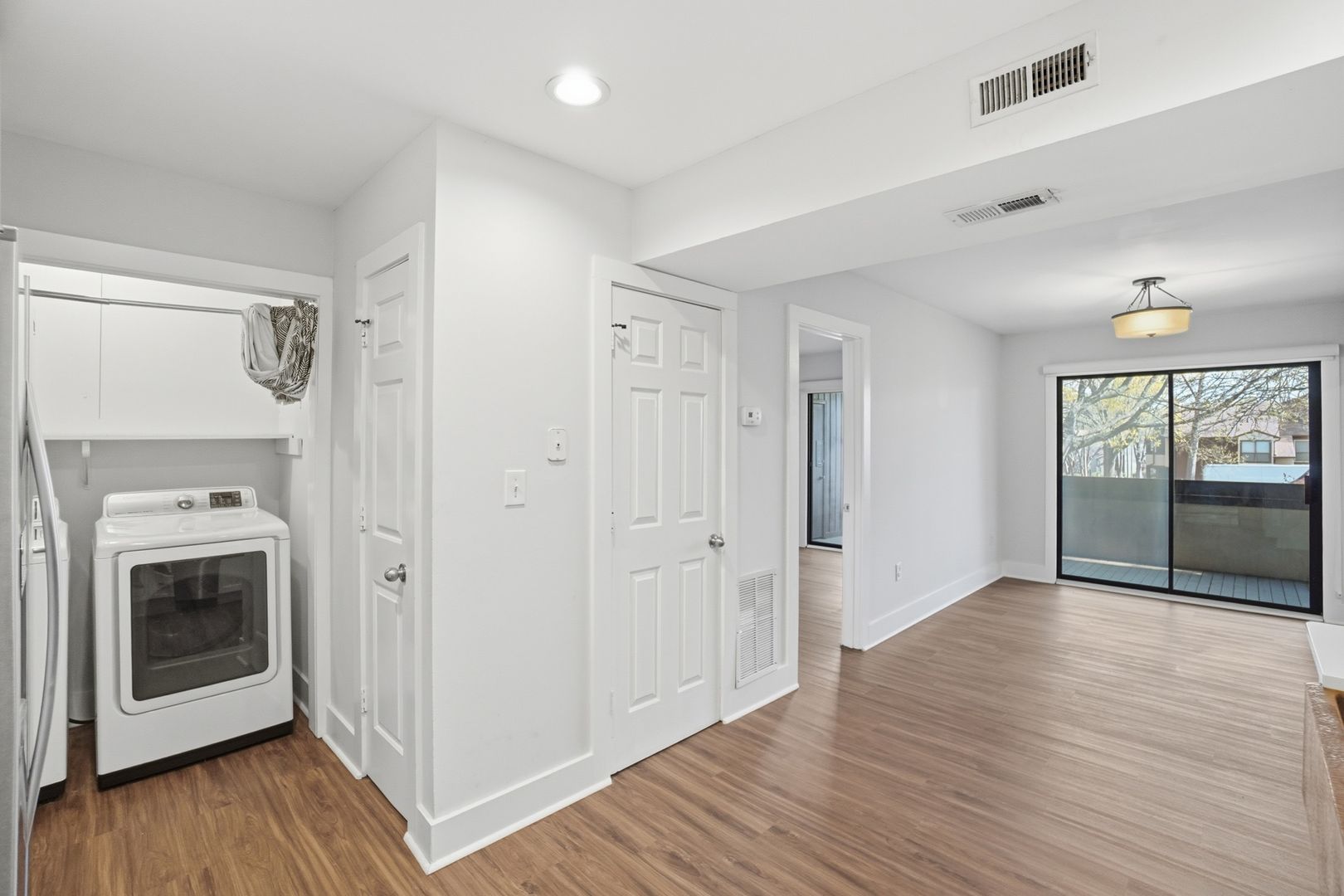 The renovated kitchen features quartz countertops, white shaker-style cabinetry, and a standout copper sink, creating a clean yet elevated design. The living room flows seamlessly into the dining area, making it perfect for entertaining. From there, step out onto the spacious balcony overlooking the community greenspace, an ideal spot to relax.