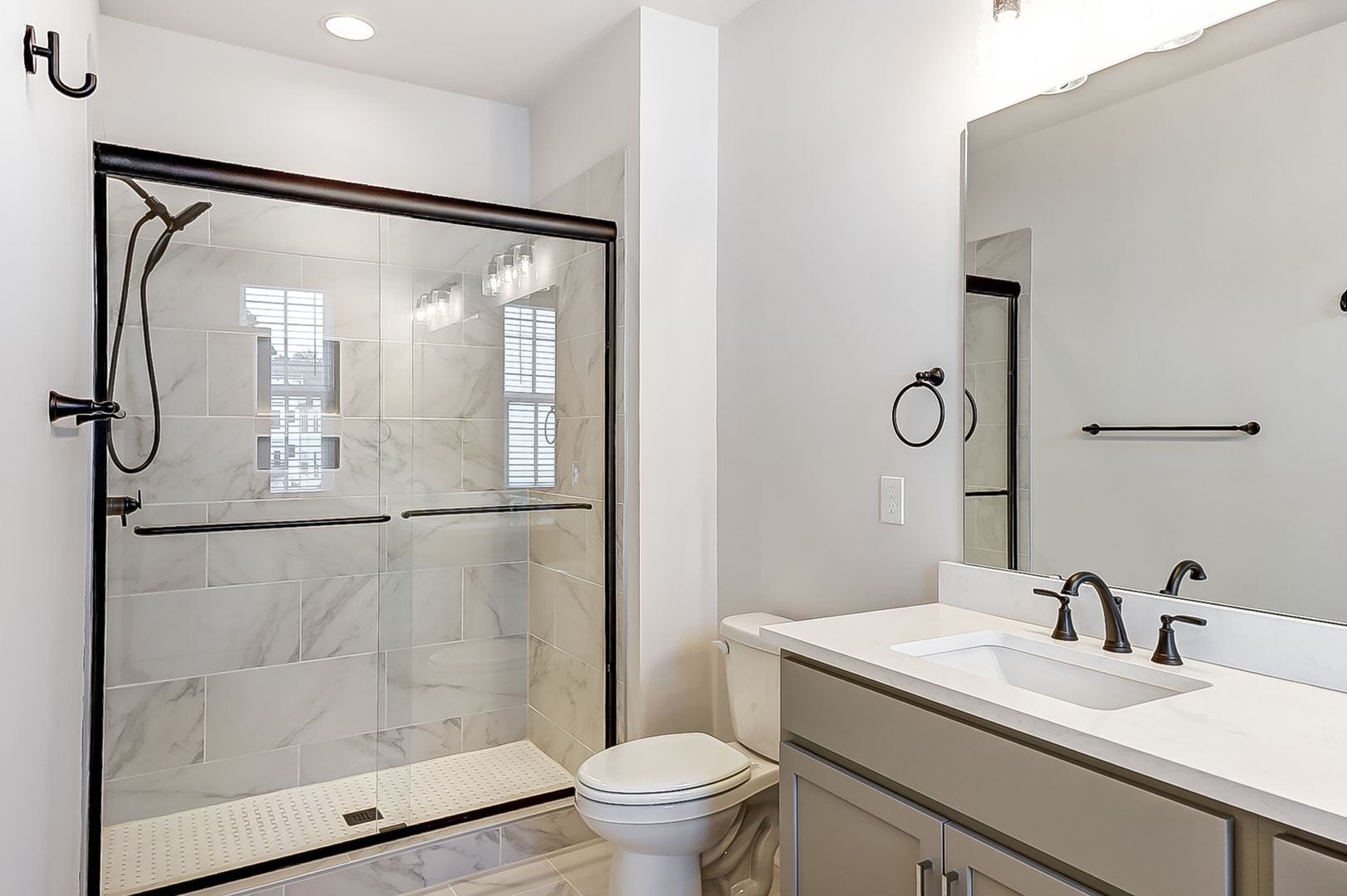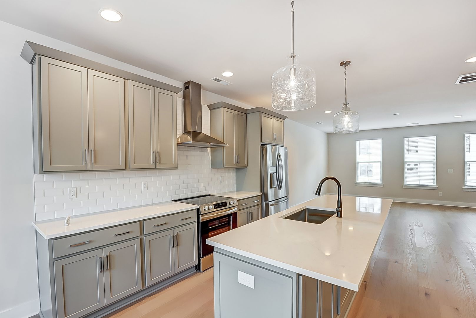 The main living level features an open-concept layout that effortlessly connects the living and dining areas to a private balcony, creating an ideal space for entertaining. The chef-inspired kitchen blends style and function with sleek shaker cabinetry, quartz countertops extending to a large center island, and modern stainless steel appliances.
