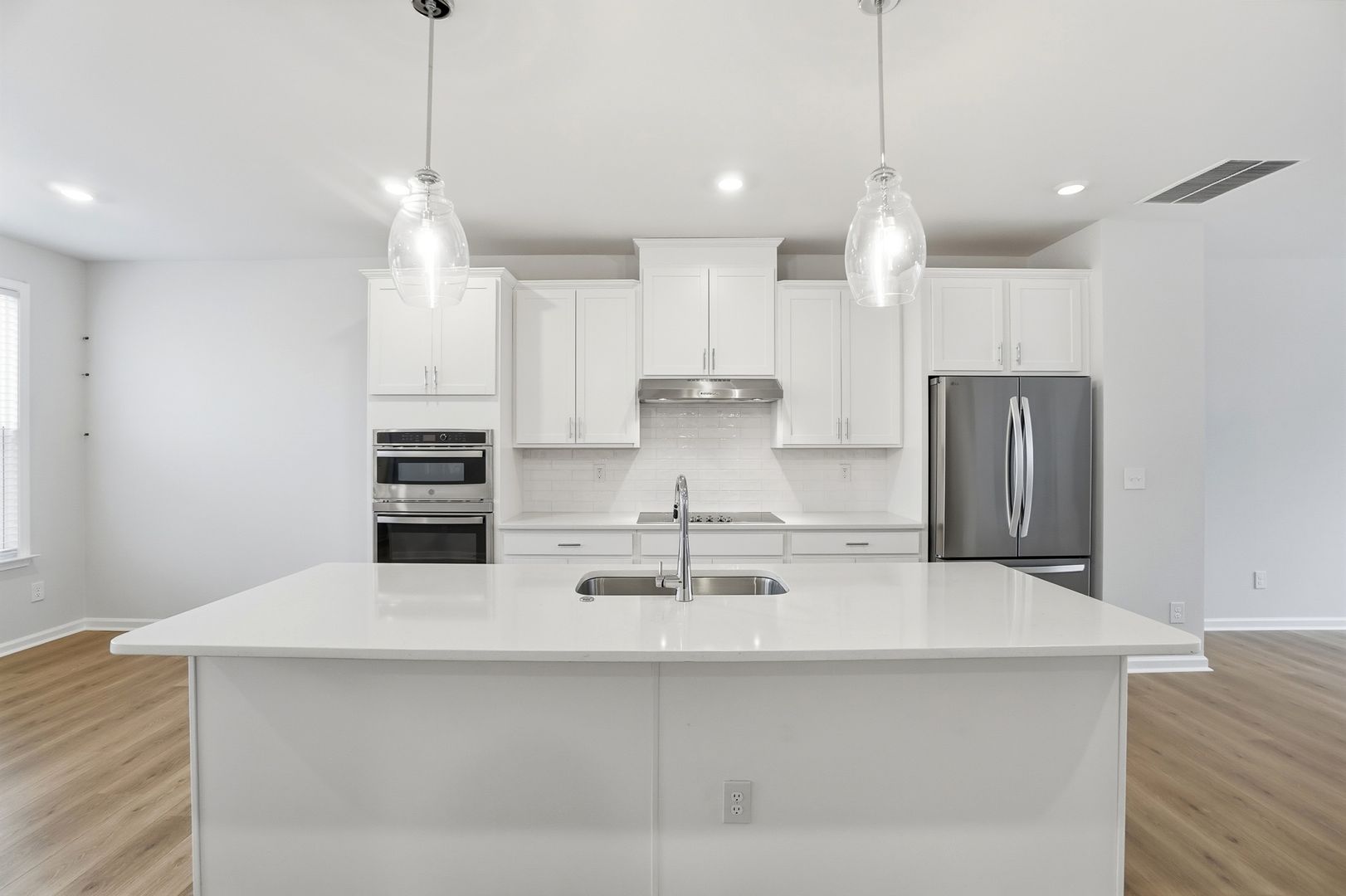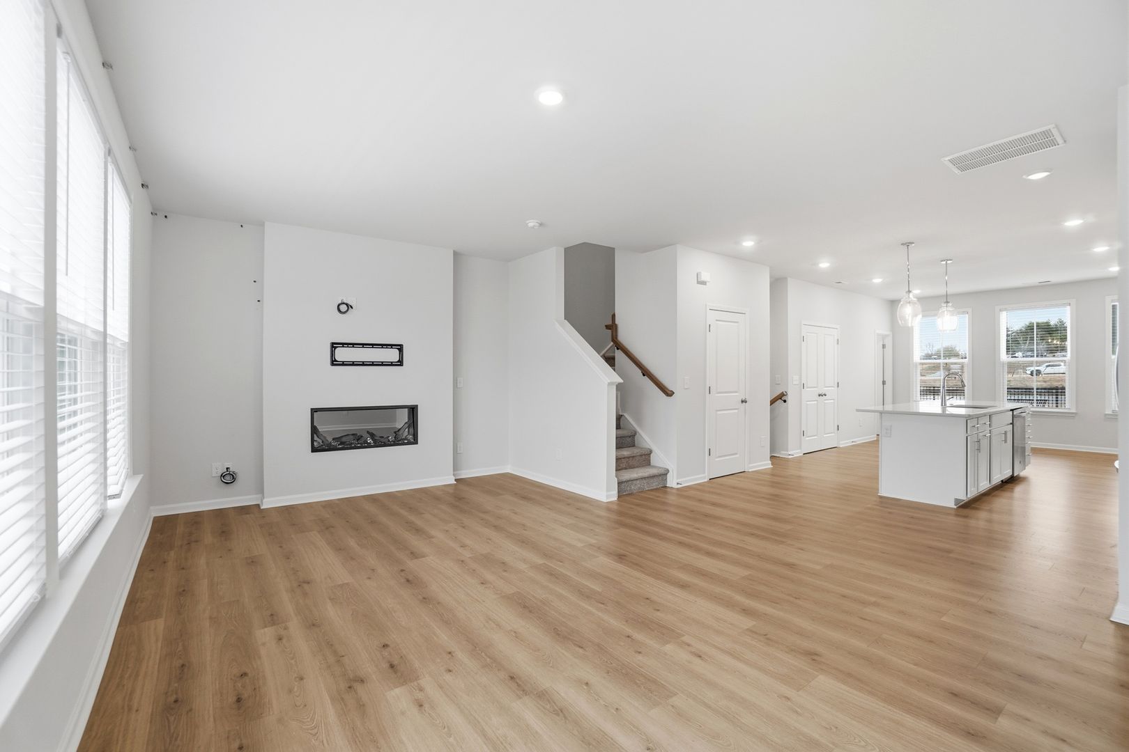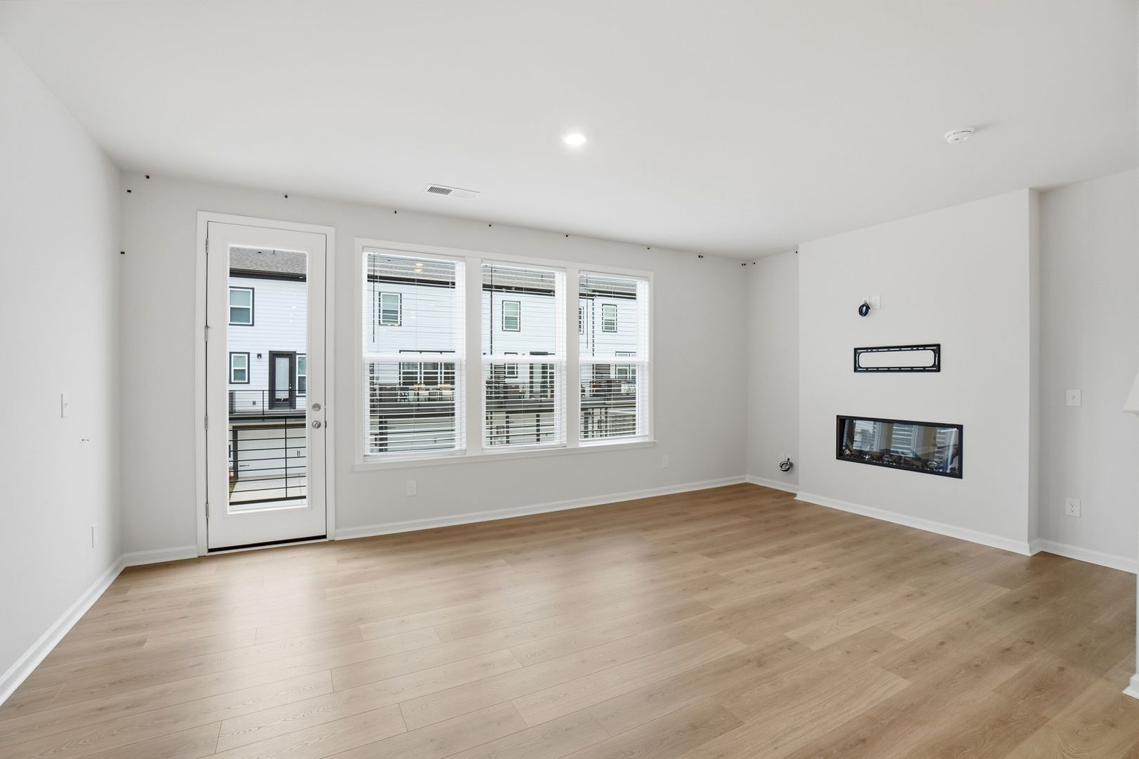 The second floor features an open-concept layout perfect for daily living and entertaining. The spacious living room, highlighted by a modern linear electric fireplace and access to a private balcony, flows seamlessly into the casual dining area and contemporary kitchen, complete with a large center island, pantry, and bright, modern finishes.