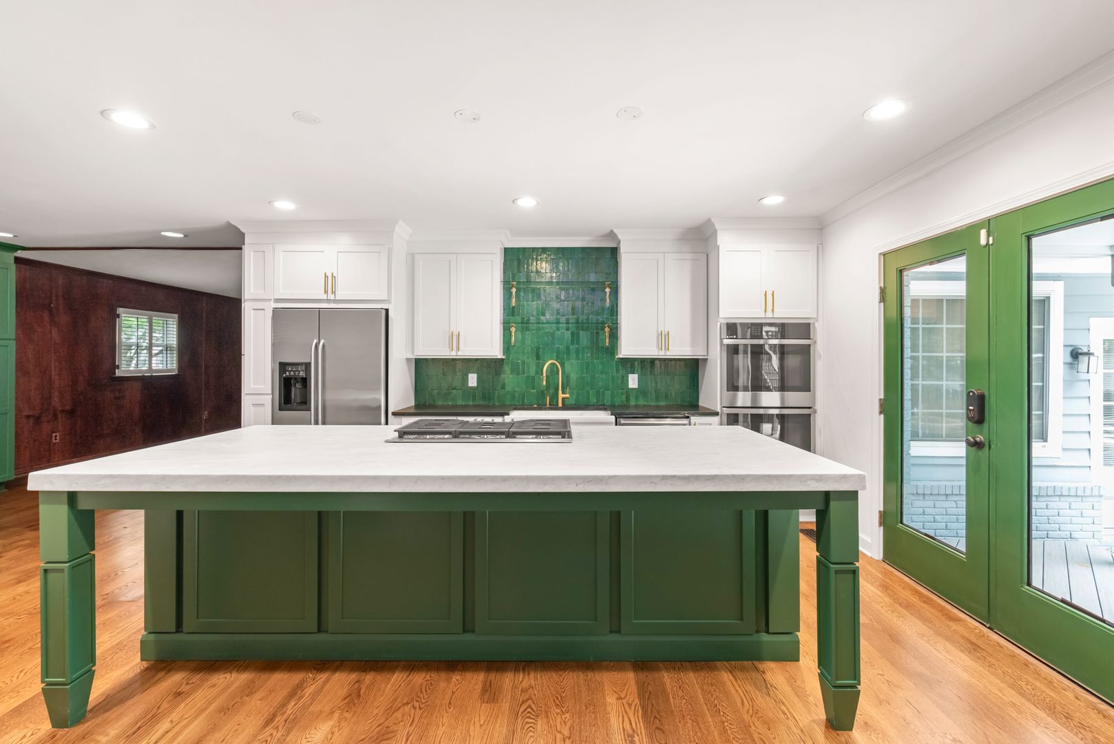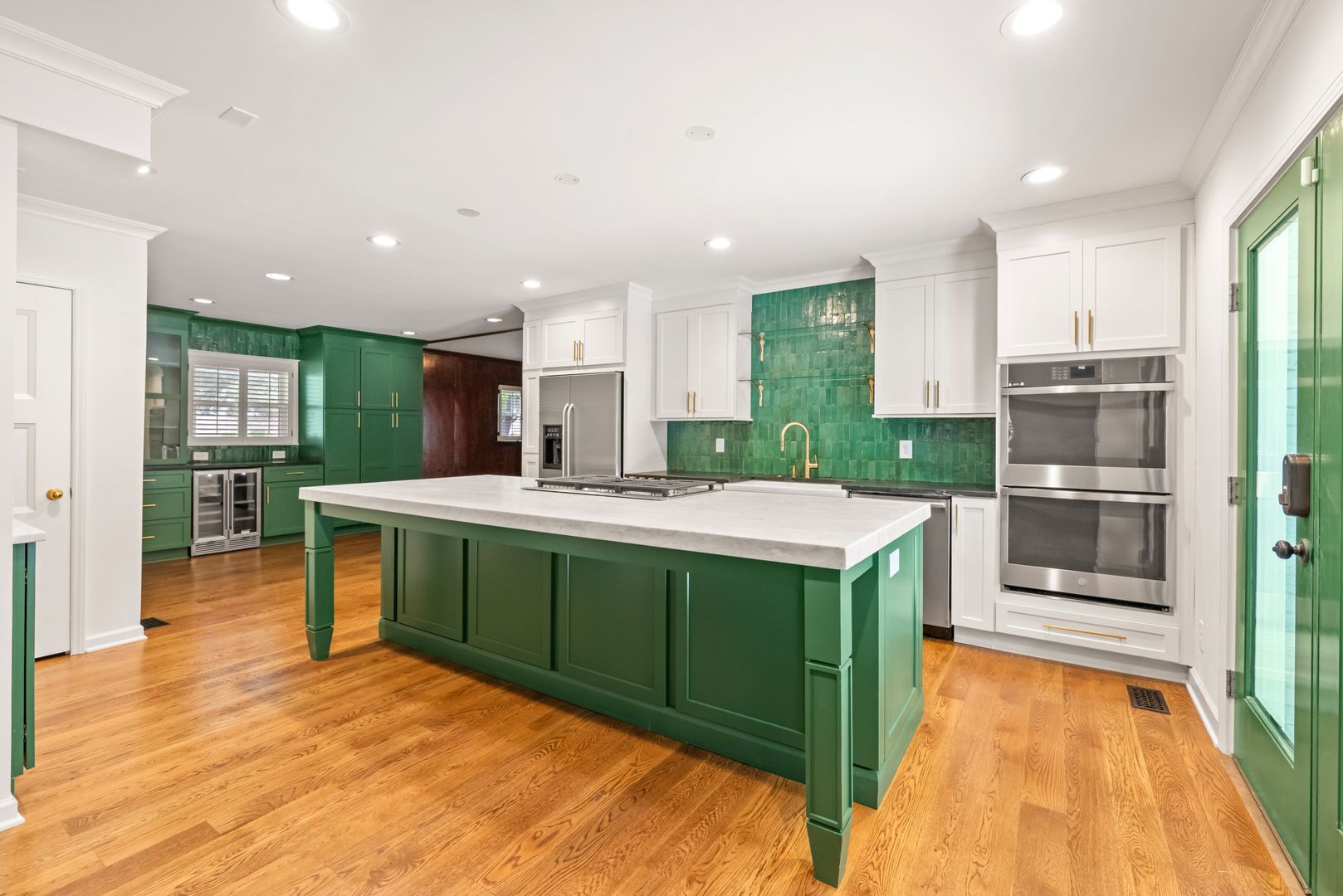 The spacious kitchen is a true highlight, featuring granite countertops, stainless steel appliances, double ovens, a center island with seating, and a cozy breakfast nook.