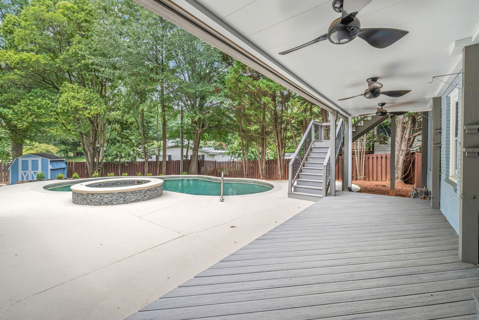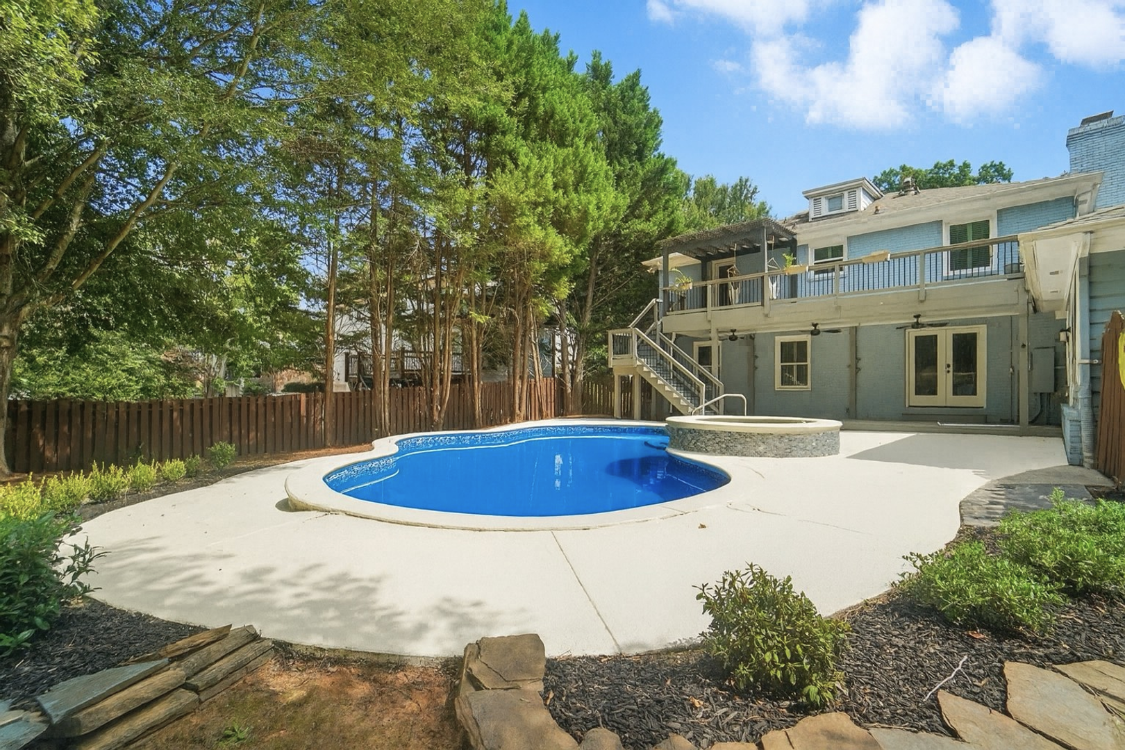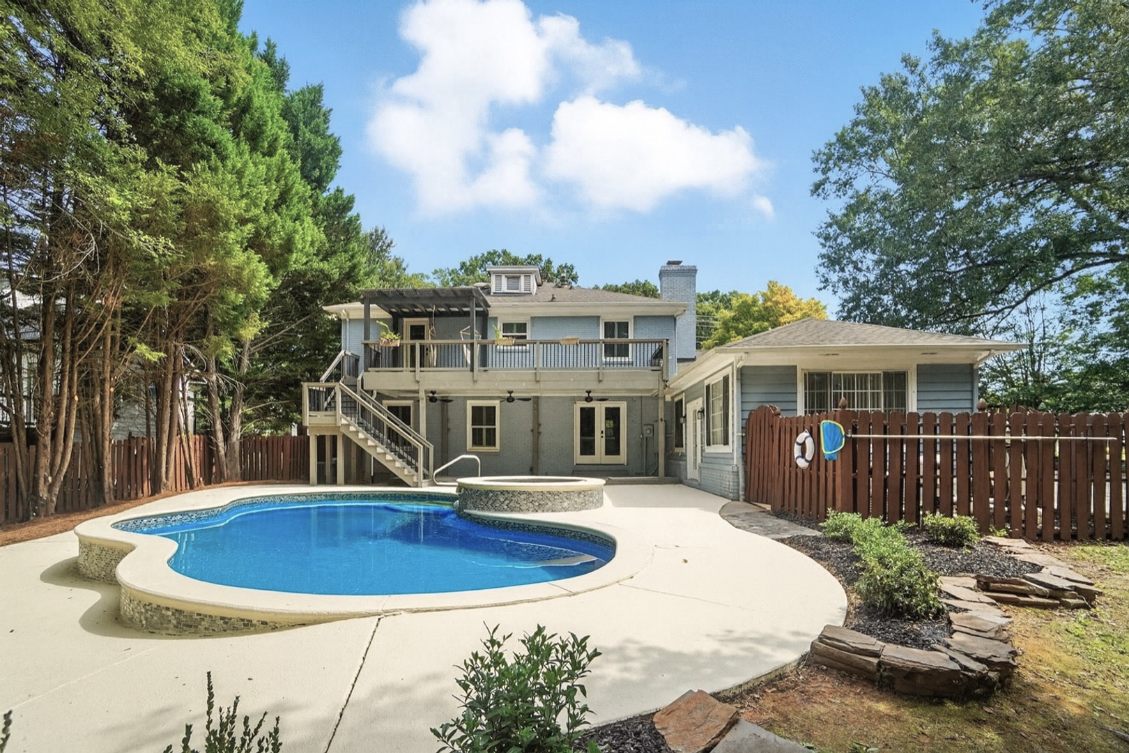 The outdoor living space is just as impressive. Enjoy your private backyard retreat with a sparkling in-ground pool, relaxing jacuzzi, and a covered patio perfect for summer gatherings. Covered front and back porches offer additional space to unwind and enjoy the peaceful surroundings.
