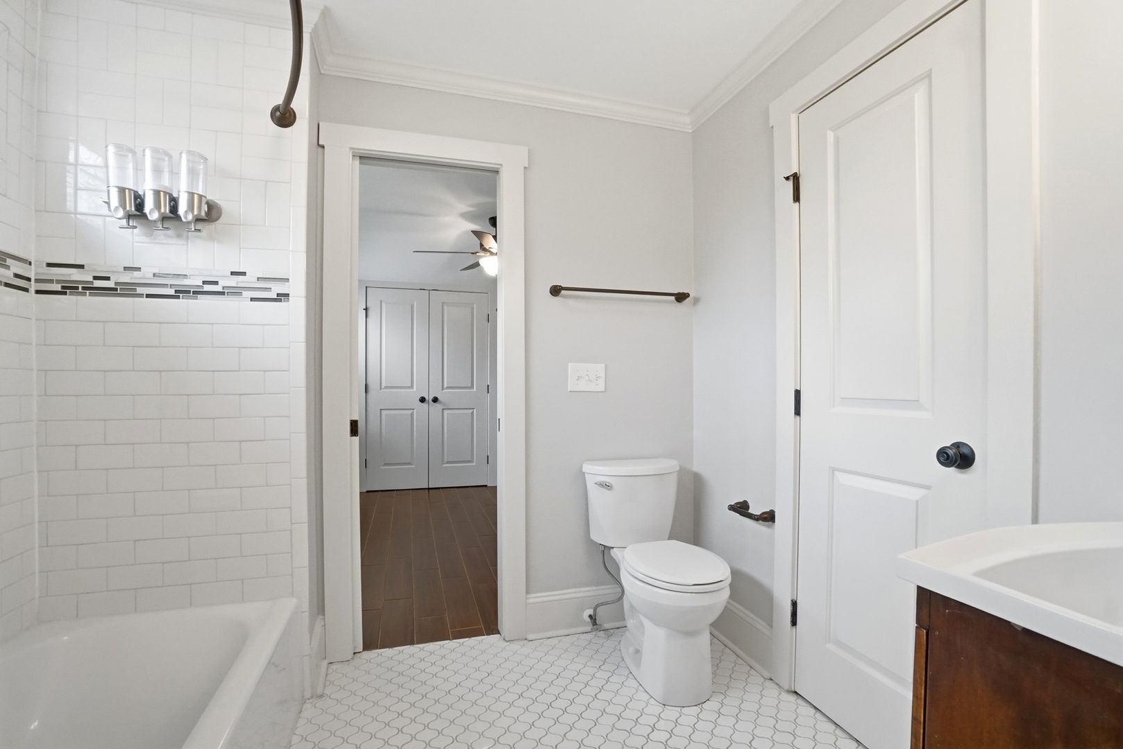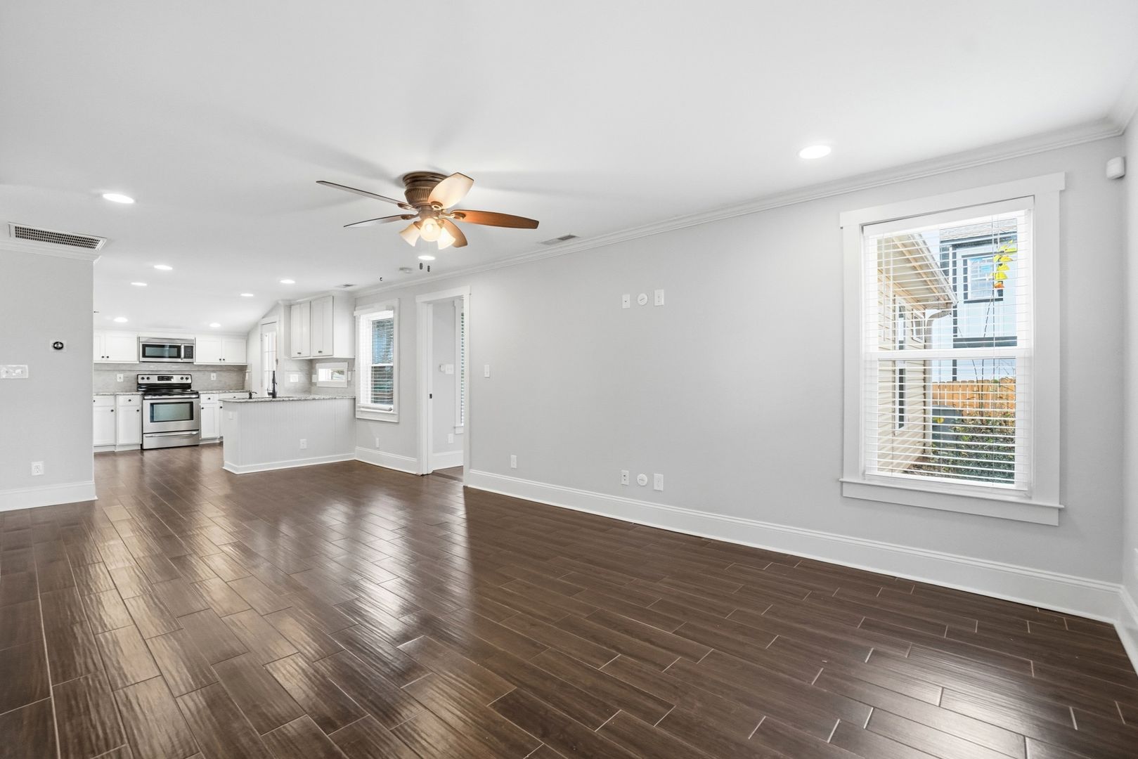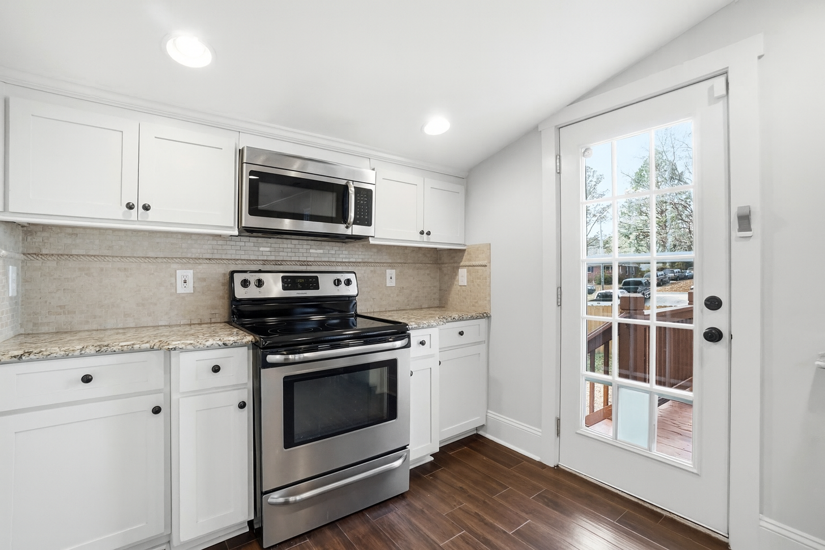 Available for rent is a beautifully updated 3-bedroom, 2-bath home featuring a spacious deck and a fully fenced backyard. This home offers a modern feel throughout, with dark tile flooring extending through most of the living areas and an open layout that seamlessly connects the living room to the stylish kitchen. The kitchen is outfitted with granite countertops, a tile backsplash, stainless steel appliances, and custom white cabinetry.