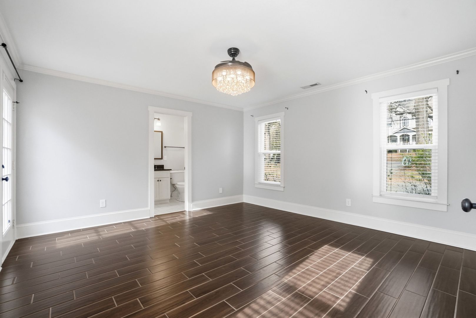 The primary bedroom offers a touch of luxury with a stunning chandelier and a wall-mounted electric fireplace. A dedicated laundry room with a washer and dryer sits just off the kitchen for added convenience. Step outside to a large back deck overlooking the private fenced yard—ideal for relaxing, grilling, or hosting gatherings.