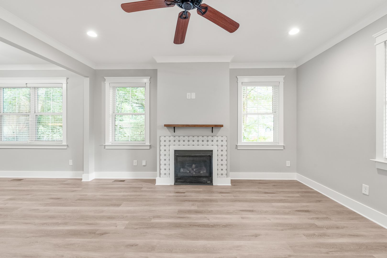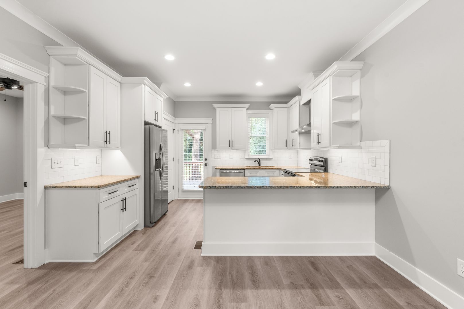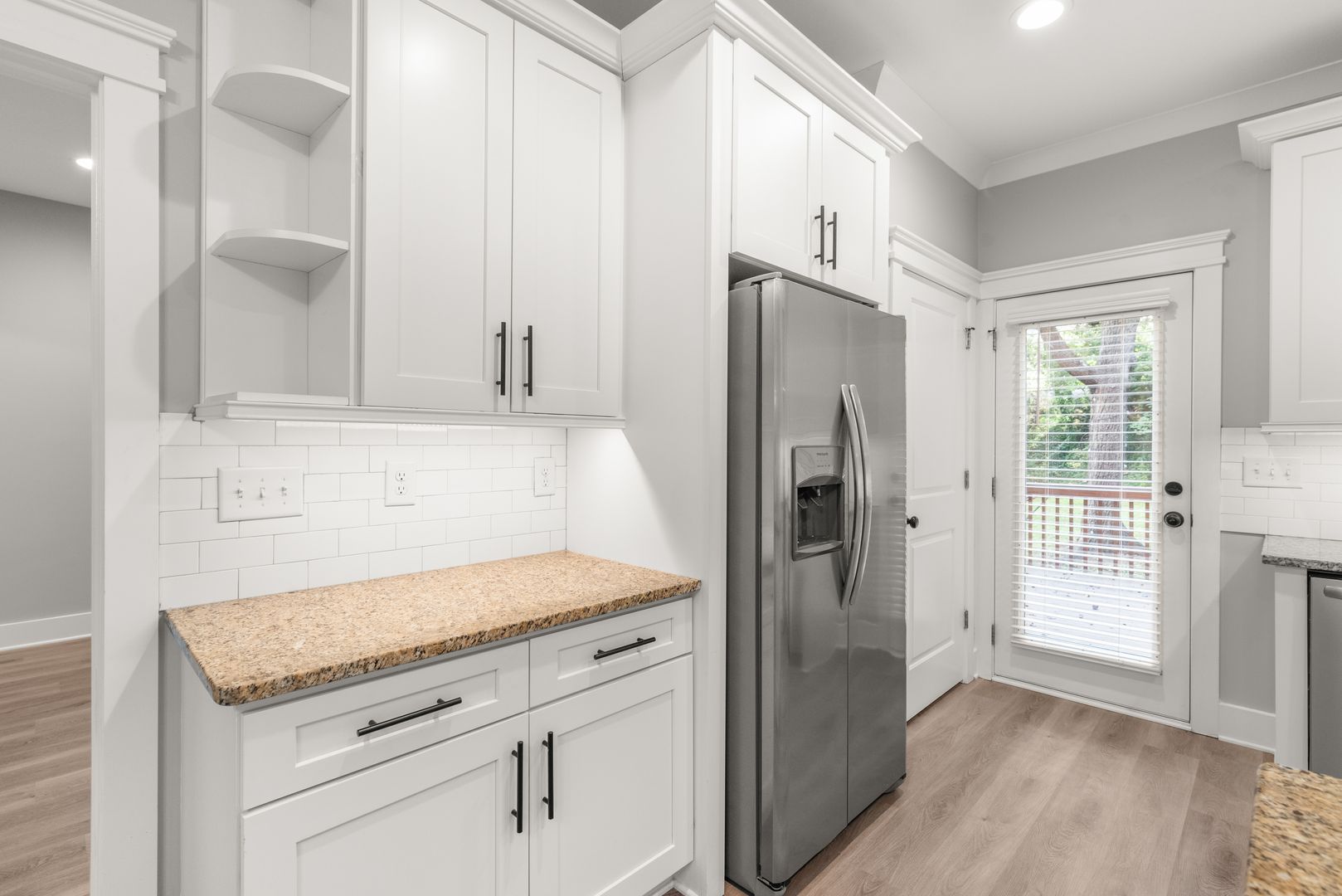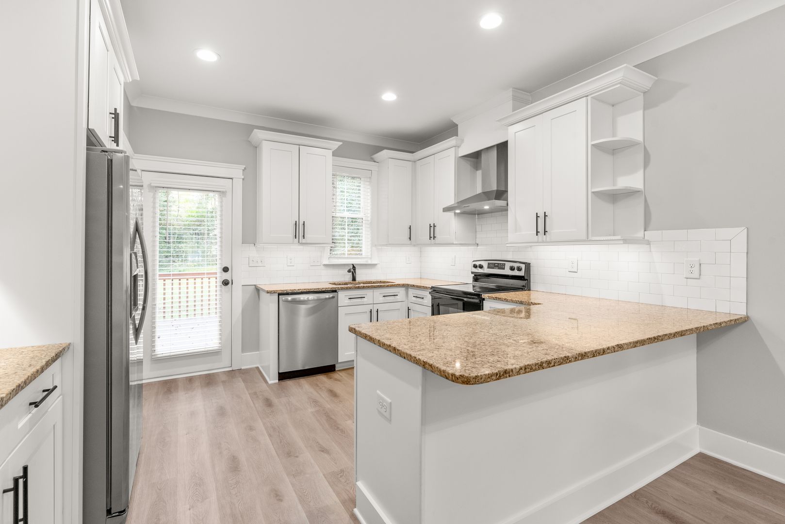 The open kitchen features stainless steel appliances, white shaker cabinets, granite countertops, and a subway tile backsplash. The living room includes a cozy gas log fireplace and large windows that fill the space with natural light. The primary bedroom offers direct access to the backyard deck and includes a walk-in closet. The attached primary bath boasts a walk-in shower, dual vanity with granite countertops, and stylish tile flooring.