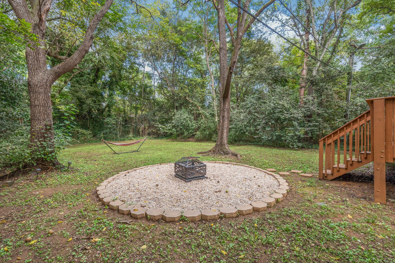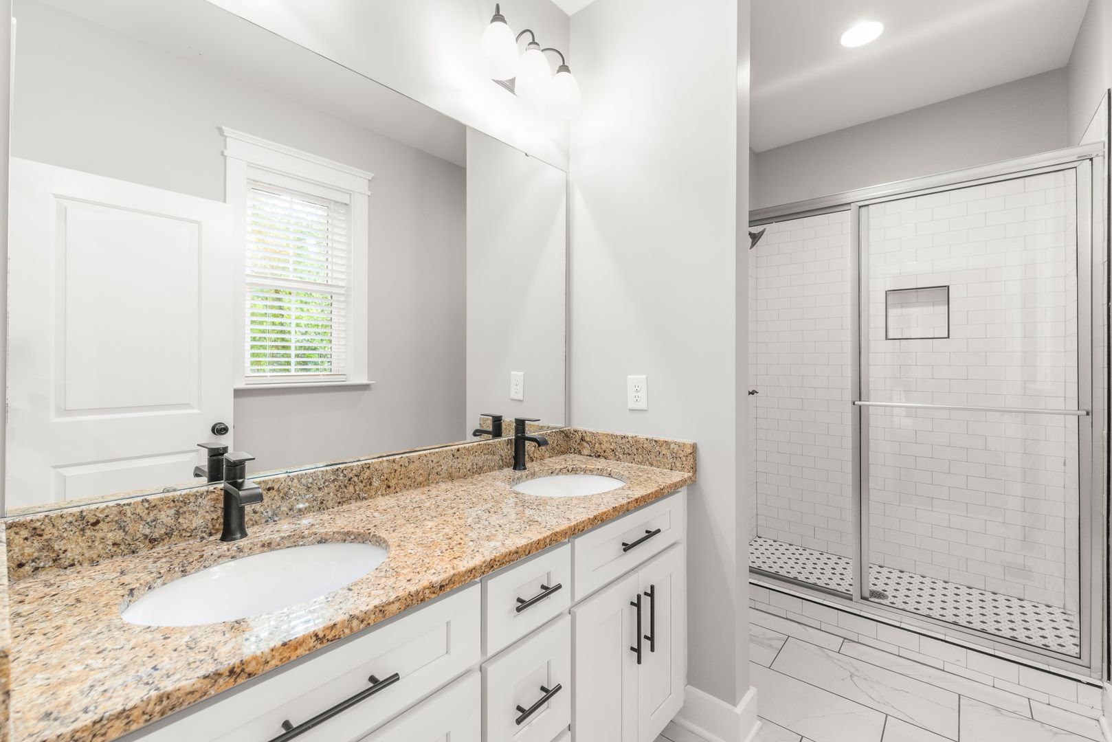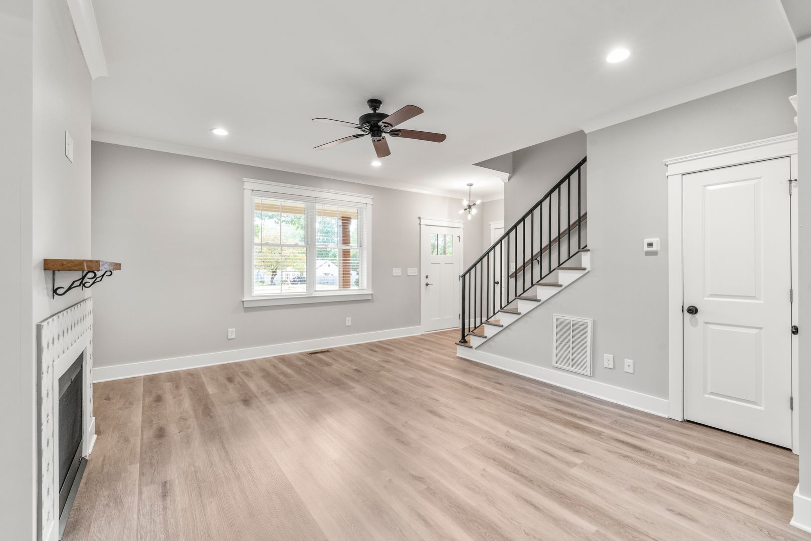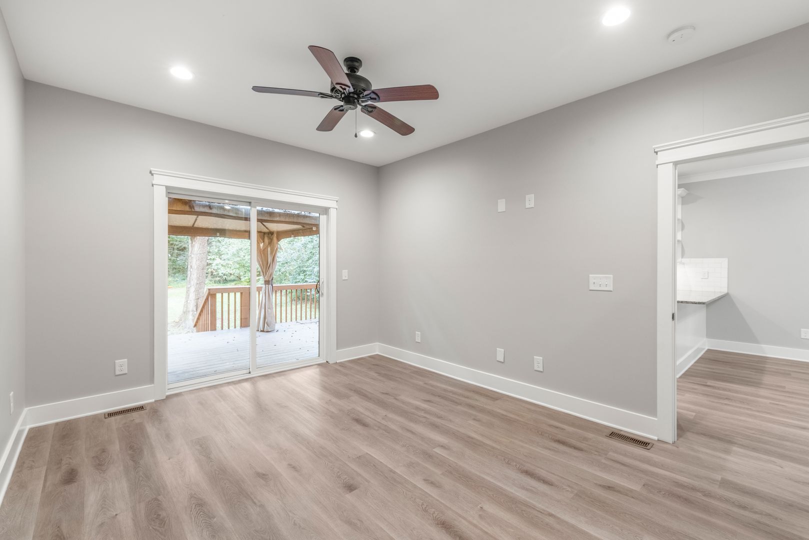 The open kitchen features stainless steel appliances, white shaker cabinets, granite countertops, and a subway tile backsplash. The living room includes a cozy gas log fireplace and large windows that fill the space with natural light. The primary bedroom offers direct access to the backyard deck and includes a walk-in closet. The attached primary bath boasts a walk-in shower, dual vanity with granite countertops, and stylish tile flooring.
