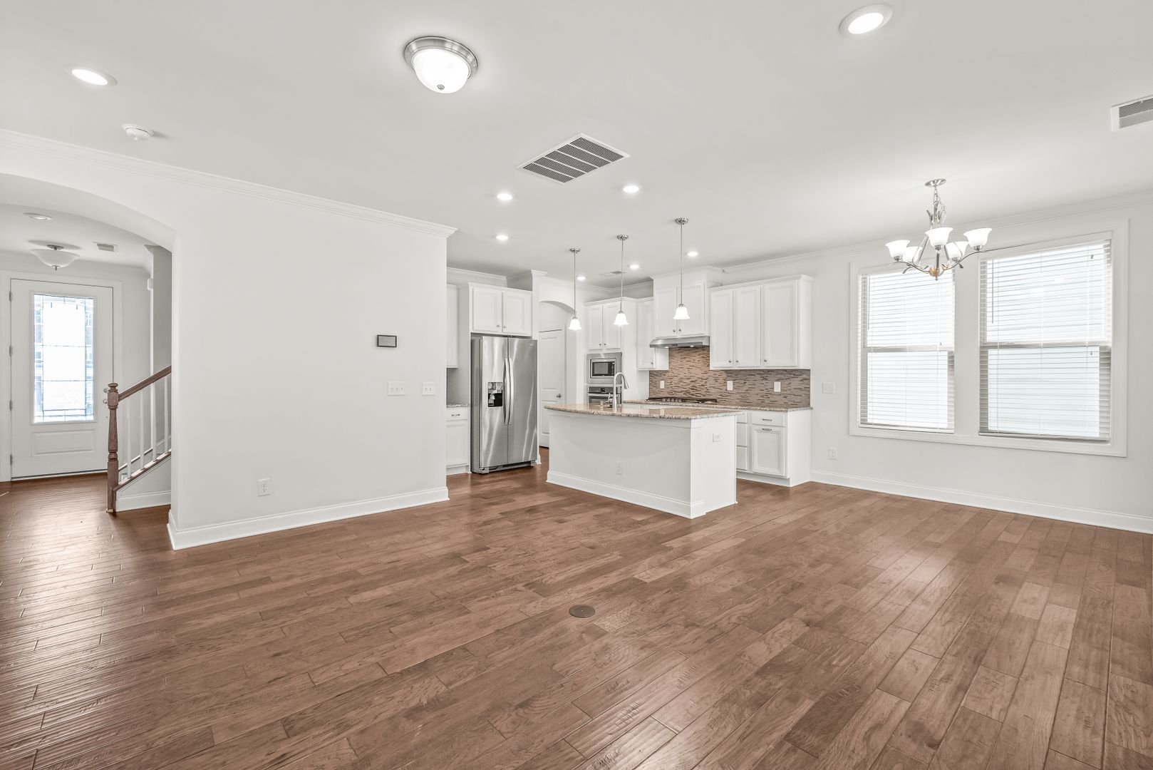 Step into this beautifully designed home featuring an open-concept layout with rich, prefinished wood flooring flowing seamlessly through the foyer, living room, dining area, and kitchen. The gourmet kitchen is a true standout, showcasing a large center island, stylish backsplash, farmhouse sink, gas range, walk-in pantry, and stainless steel appliances, perfect for both everyday living and entertaining.