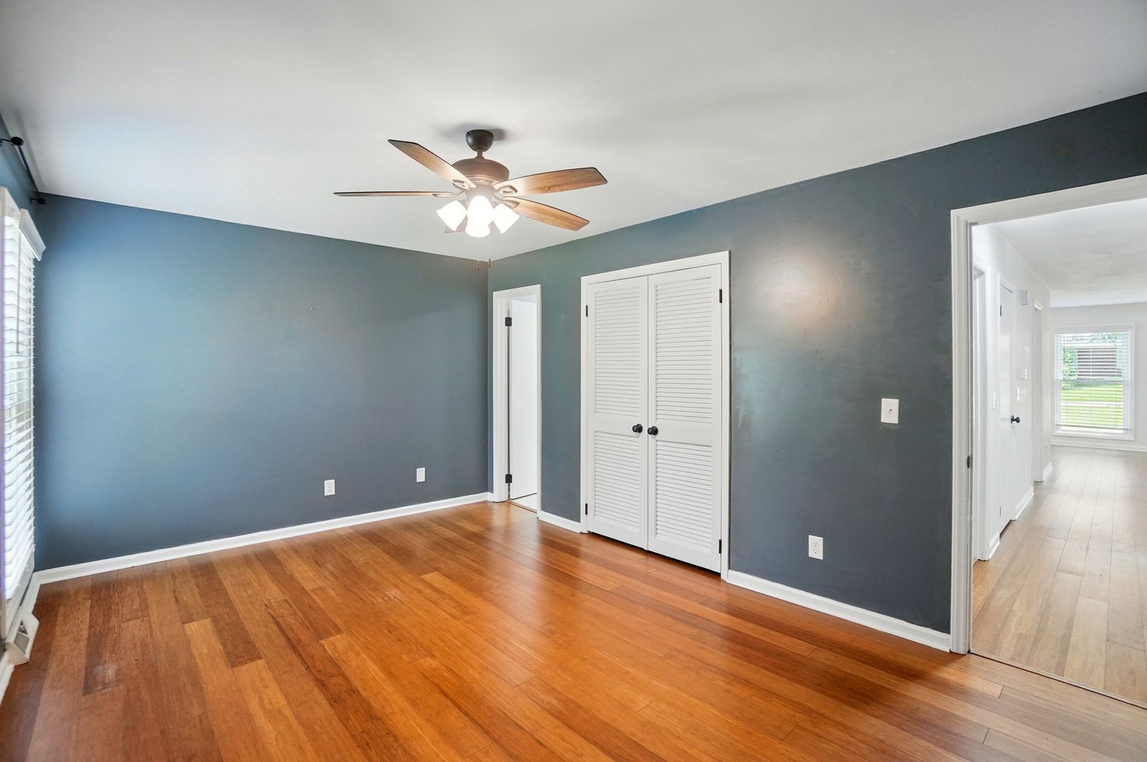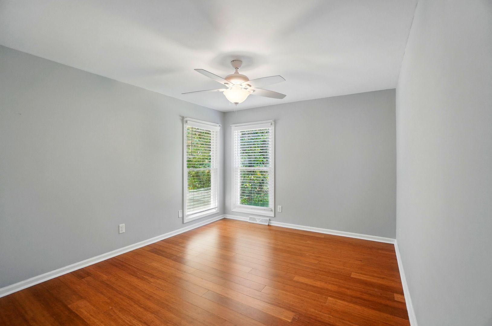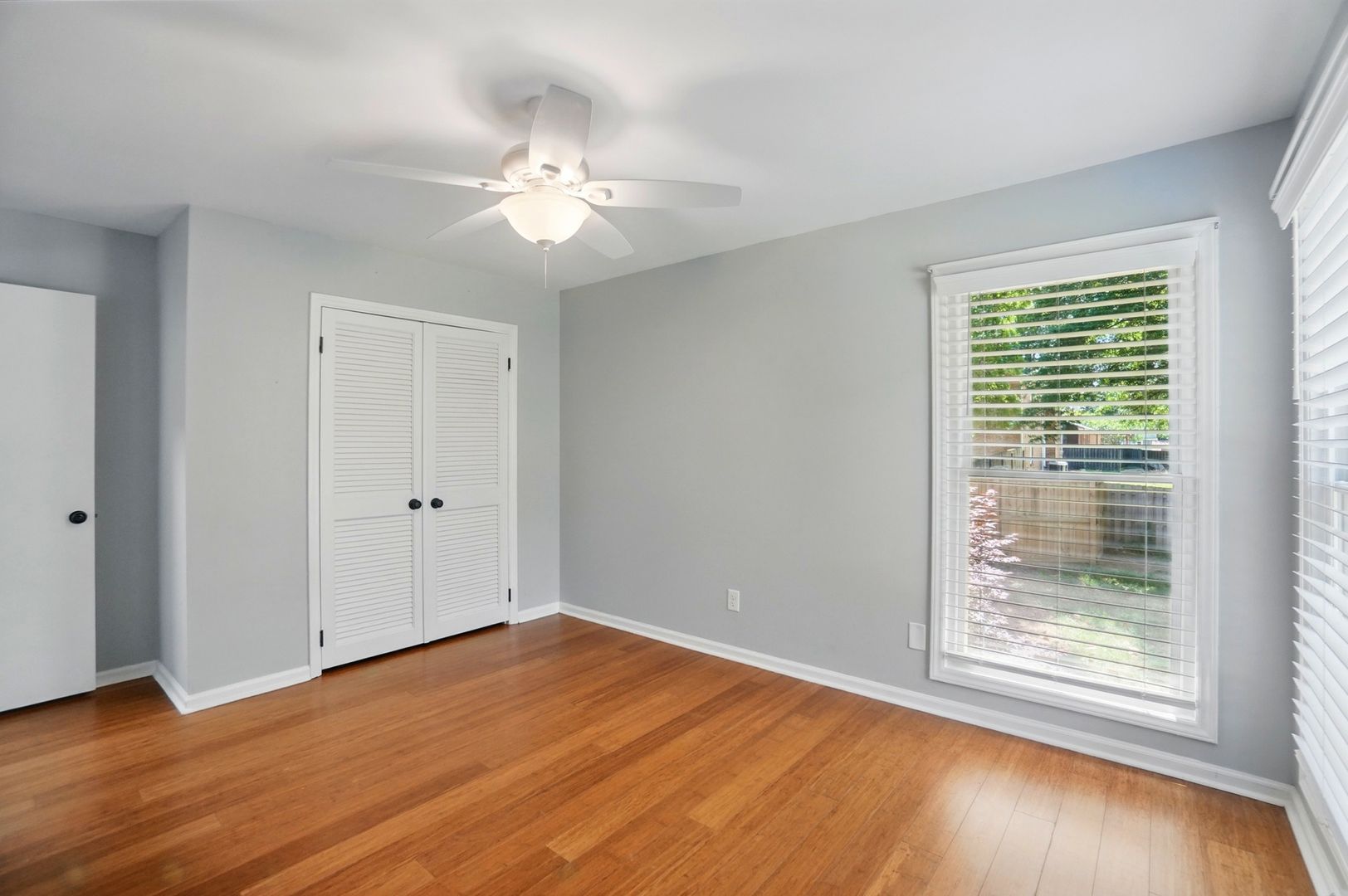 The primary bedroom is conveniently located on the main level and features ample closet space and an en suite bath. An additional bedroom and a half bath complete the main floor.
