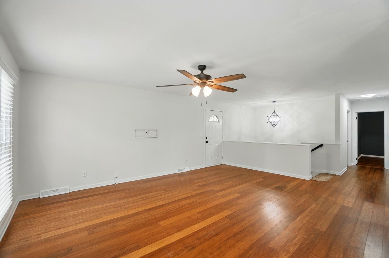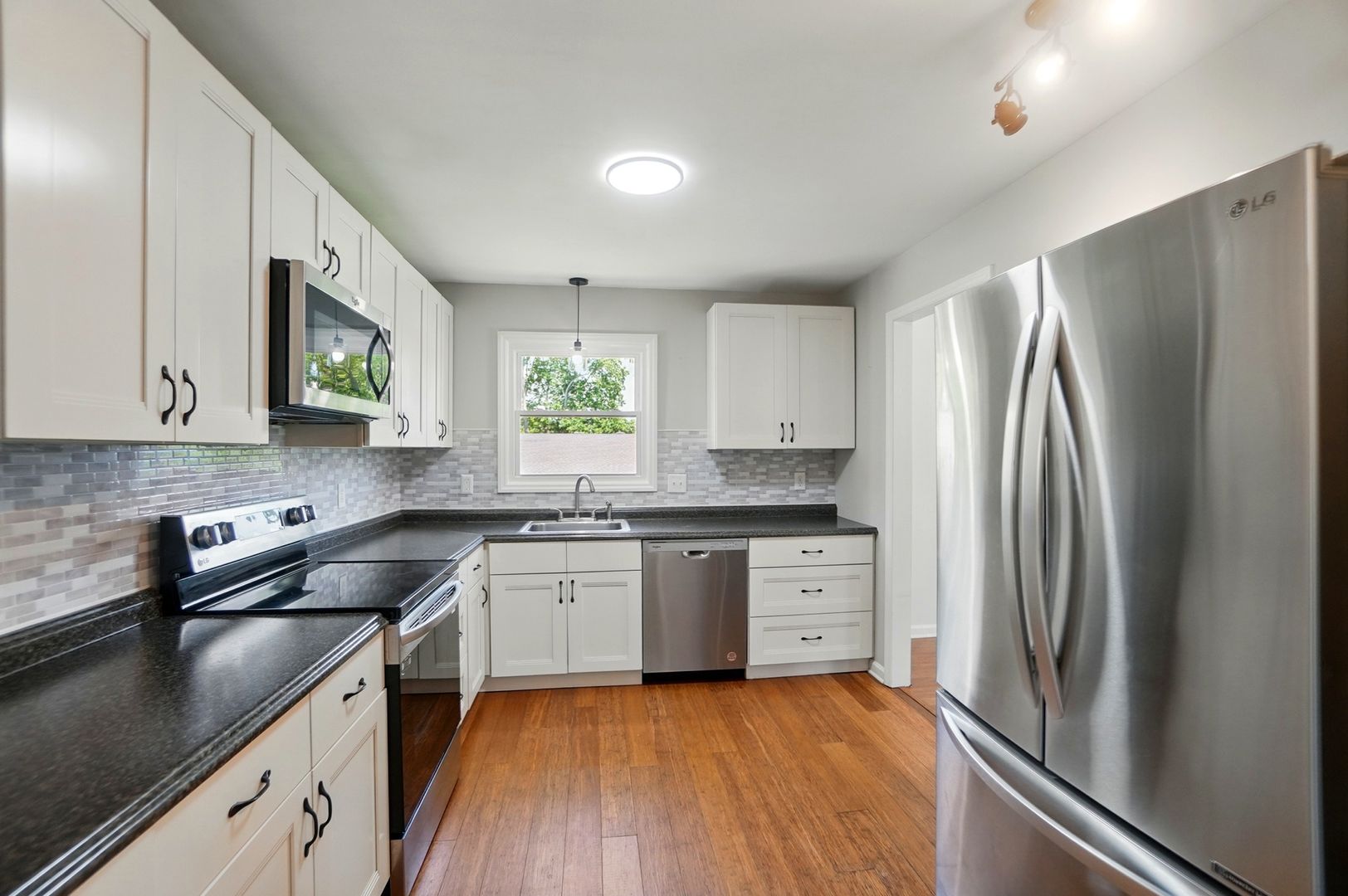 Inside, you're greeted by gleaming hardwood floors that flow throughout the open concept living and dining areas, creating a warm and inviting atmosphere. The kitchen has been thoughtfully updated with soft close cabinetry, sleek countertops, and stainless steel appliances, ideal for both everyday use and entertaining.