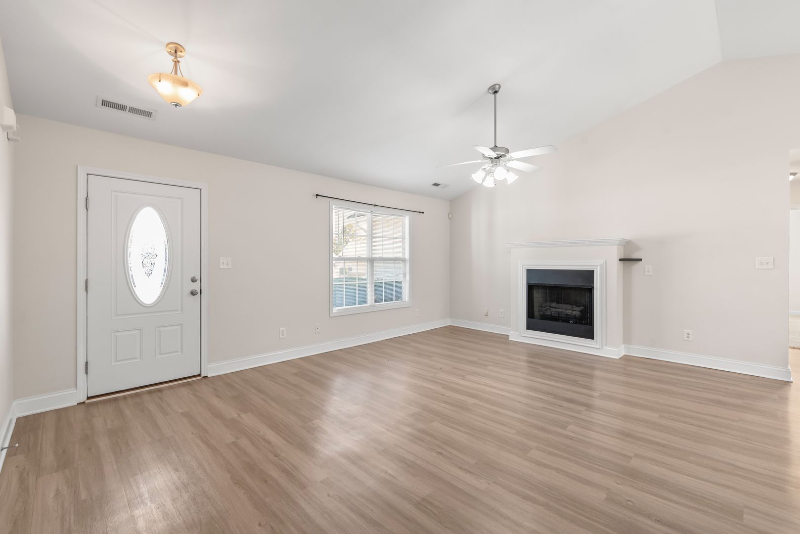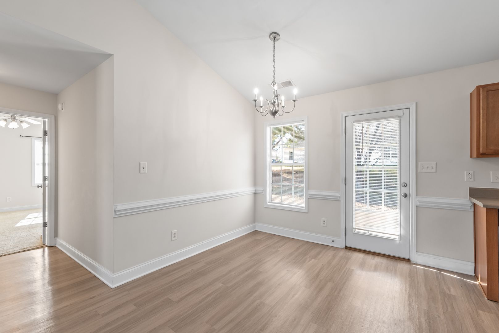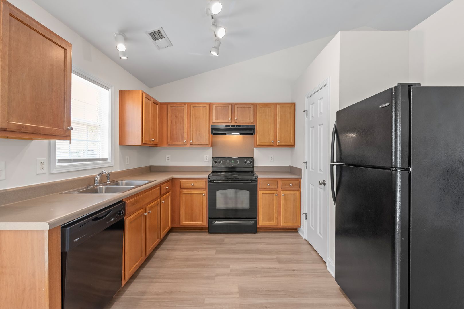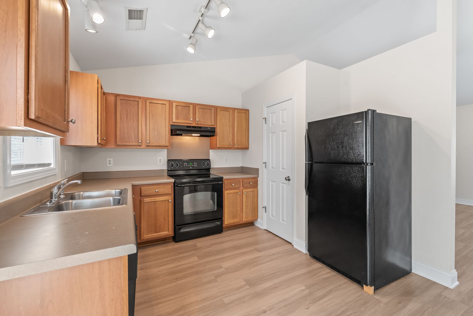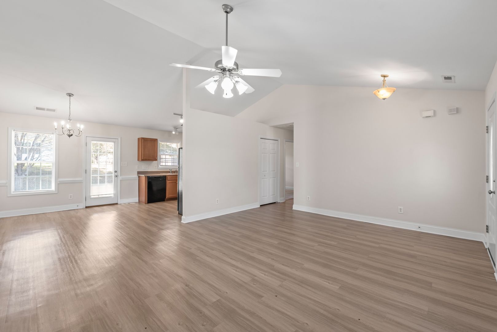 Located on a quiet cul-de-sac street is a well kept 3 bedroom ranch with a two-car garage. Walk inside and you will see an open living room with vaulted ceilings. The home features brand new Washed Oak Luxury Vinyl Plank (LVP) flooring throughout the living room, kitchen, bathrooms, and hallway. Good sized kitchen with black appliances, plenty of cabinets for storage, pantry, and kitchen eating area. Sliding glass doors off of the kitchen lead to a backyard patio.