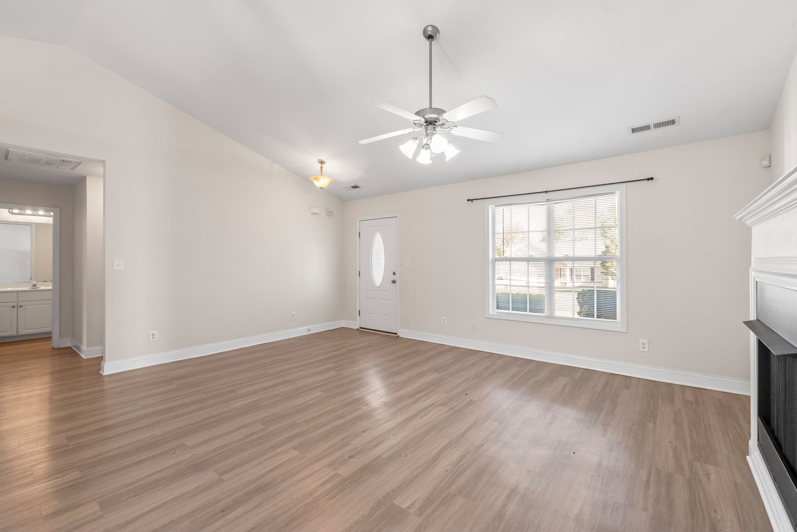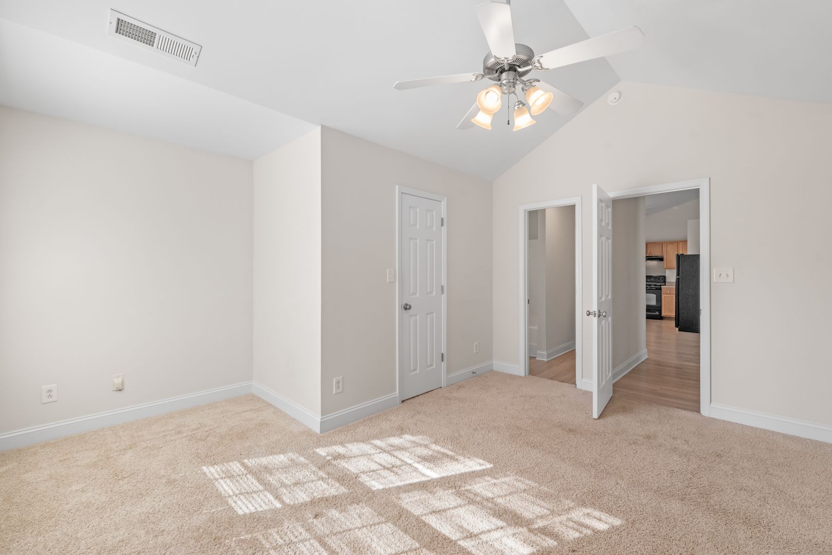 Spacious Primary bedroom, with high ceilings and a walk in closet. Split floor plan, with the two additional bedrooms on the opposite end of the home. Laundry with washer and dryer connections.