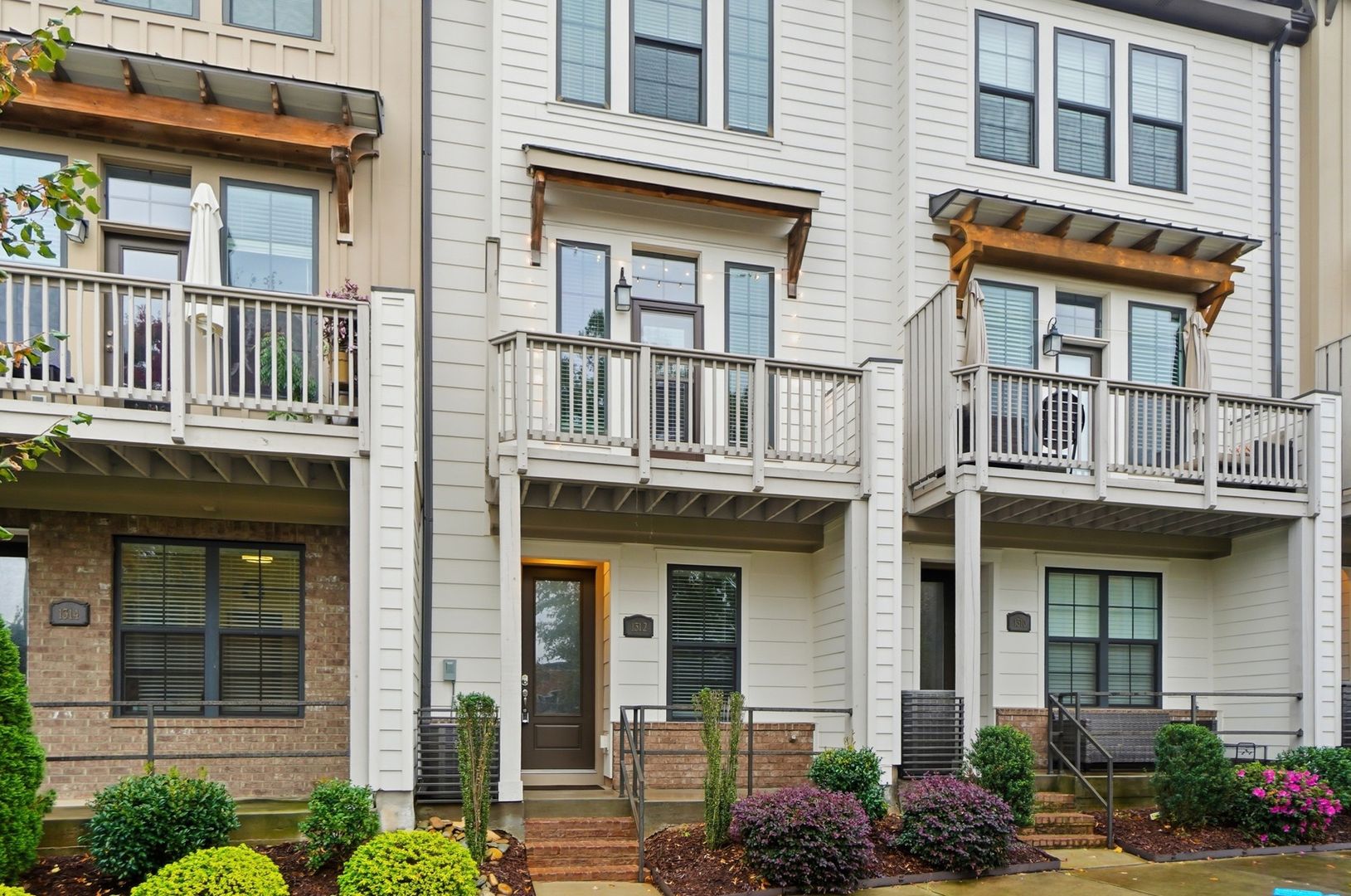 The main level features an open floor plan with 10-foot ceilings, LVP flooring, and a balcony showcasing stunning skyline views. The kitchen offers granite countertops, stainless steel appliances, a gas range, custom backsplash, and a large island perfect for entertaining.