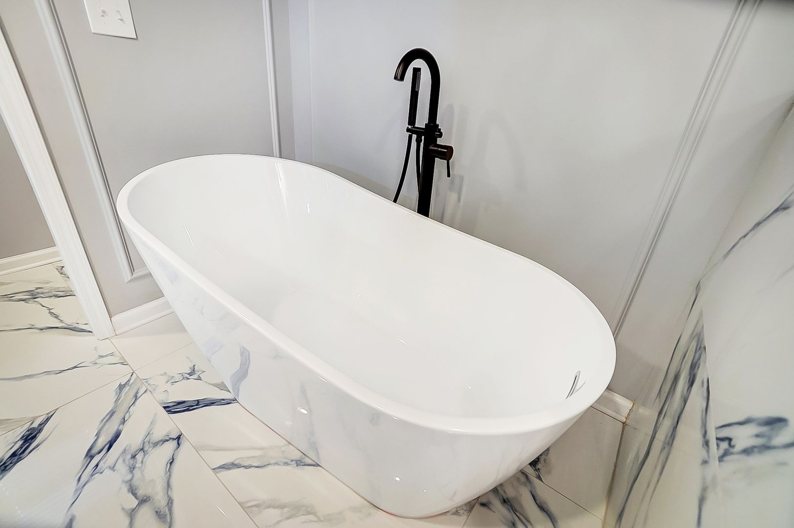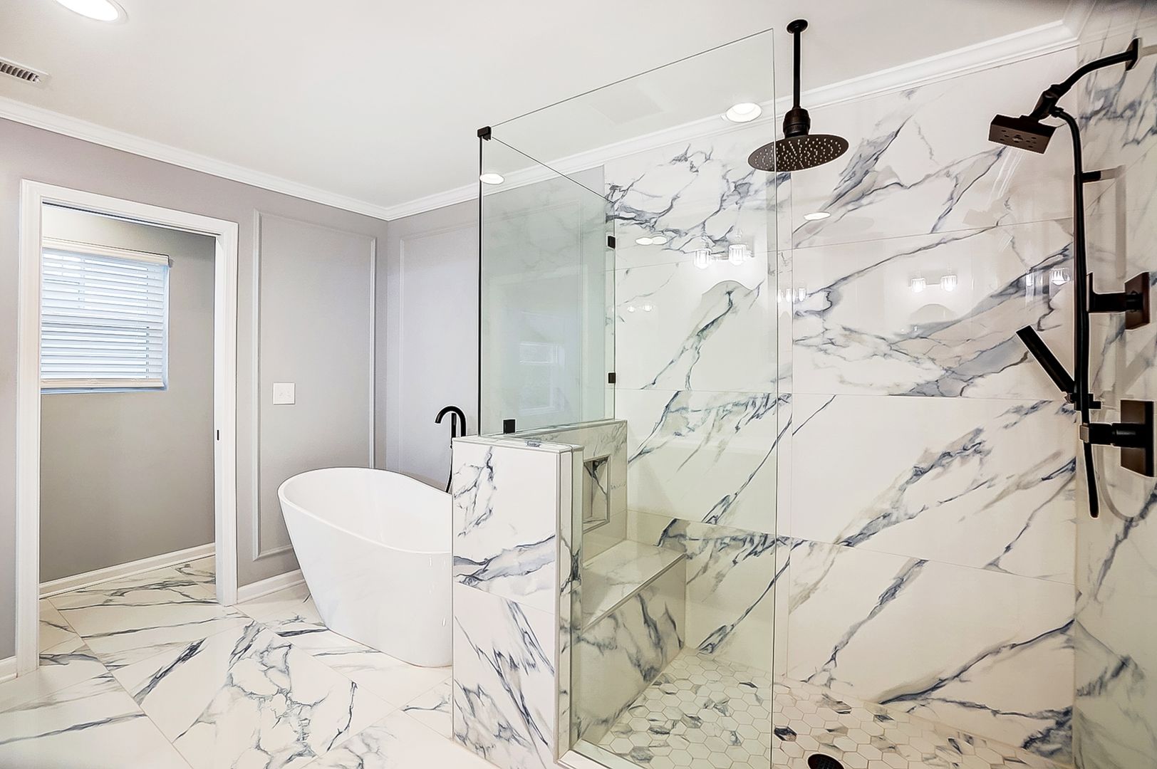 The main level features a luxurious primary suite with a spa-like bathroom, complete with a soaking tub, dual shower heads, tiled walk-in shower, dual vanities, and a custom walk-in closet.