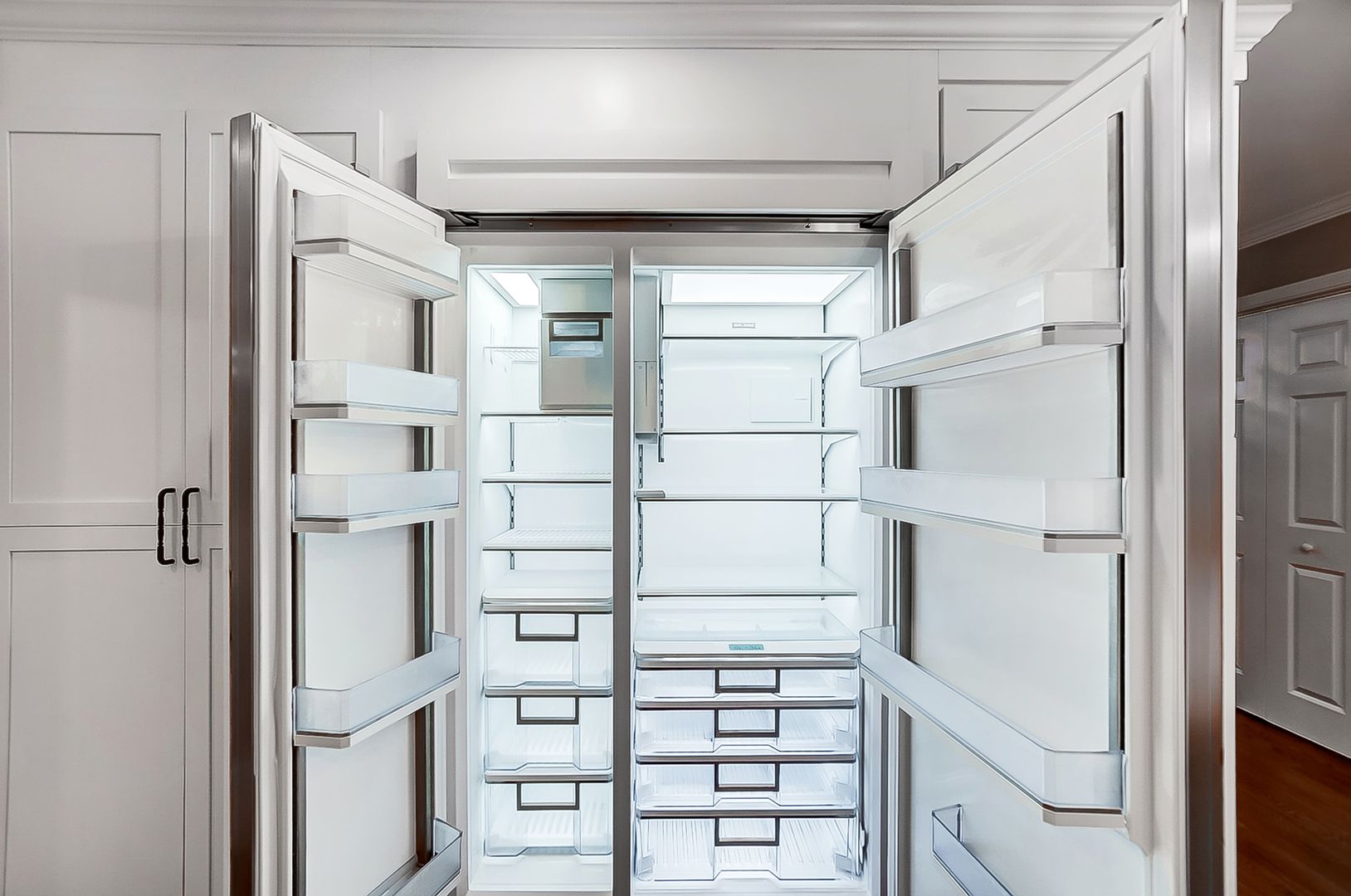 The chef’s kitchen is a true centerpiece, featuring a premium Fulgor Milano range, Sub-Zero refrigerator/freezer, quartz countertops, custom cabinetry, a large center island, and a spacious pantry, perfect for both everyday living and entertaining.