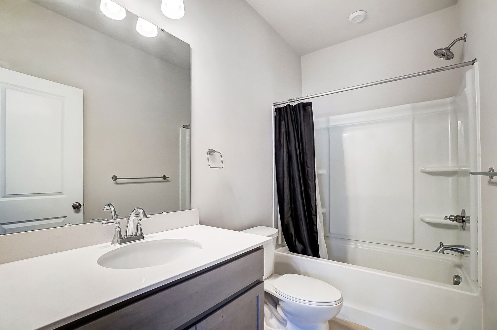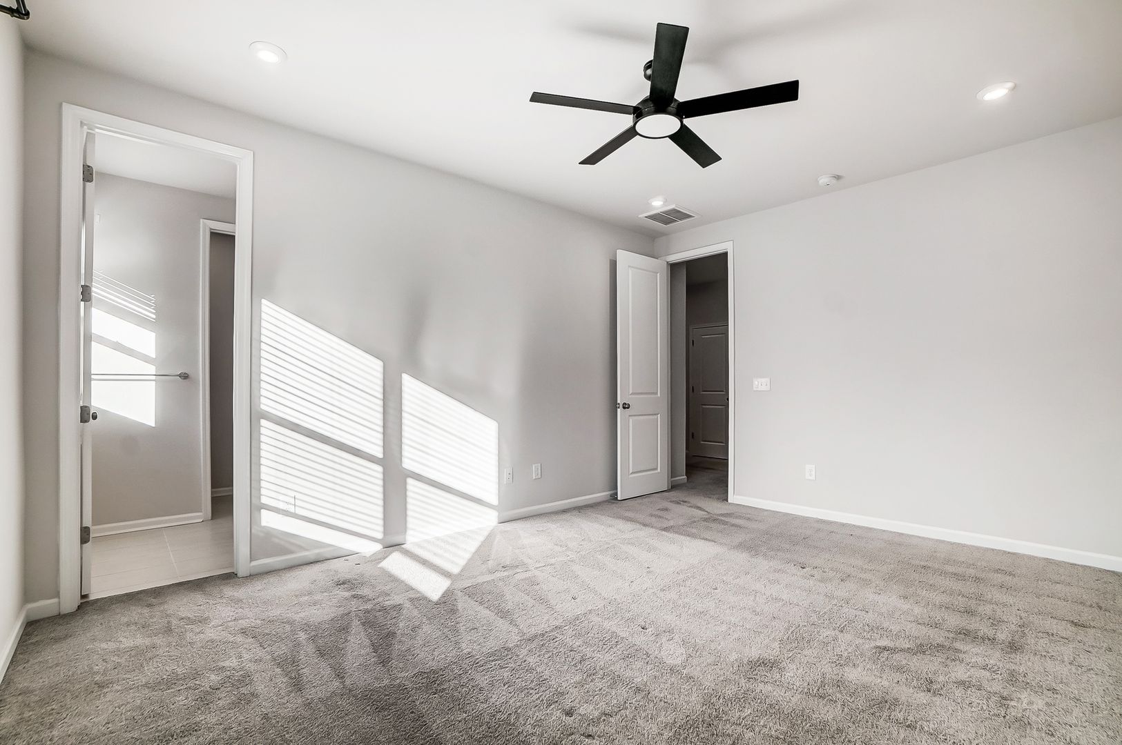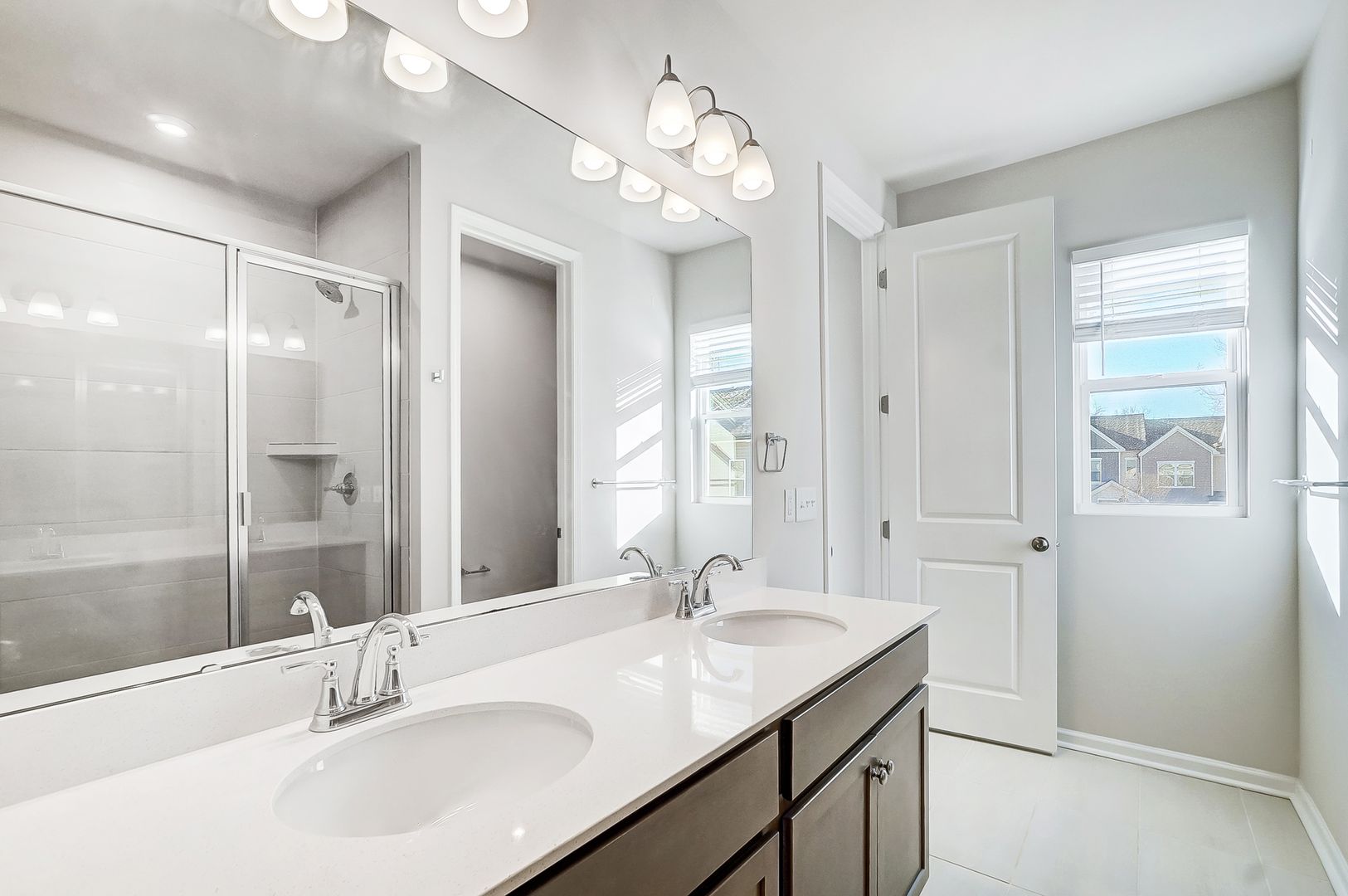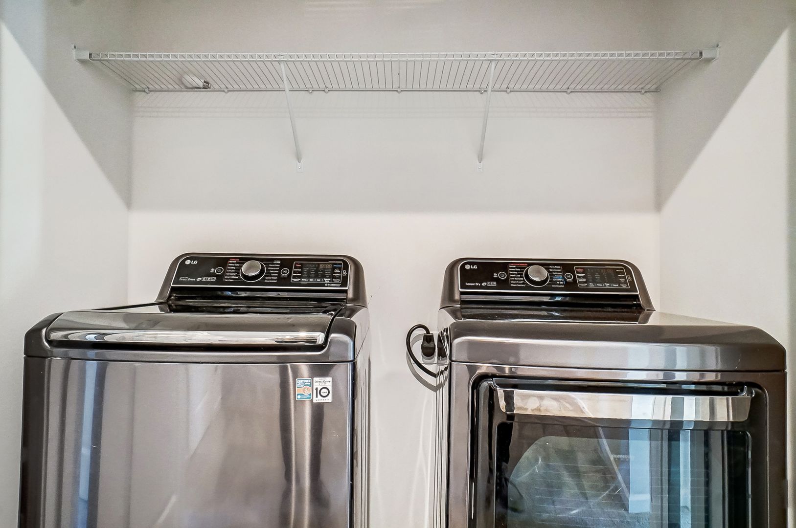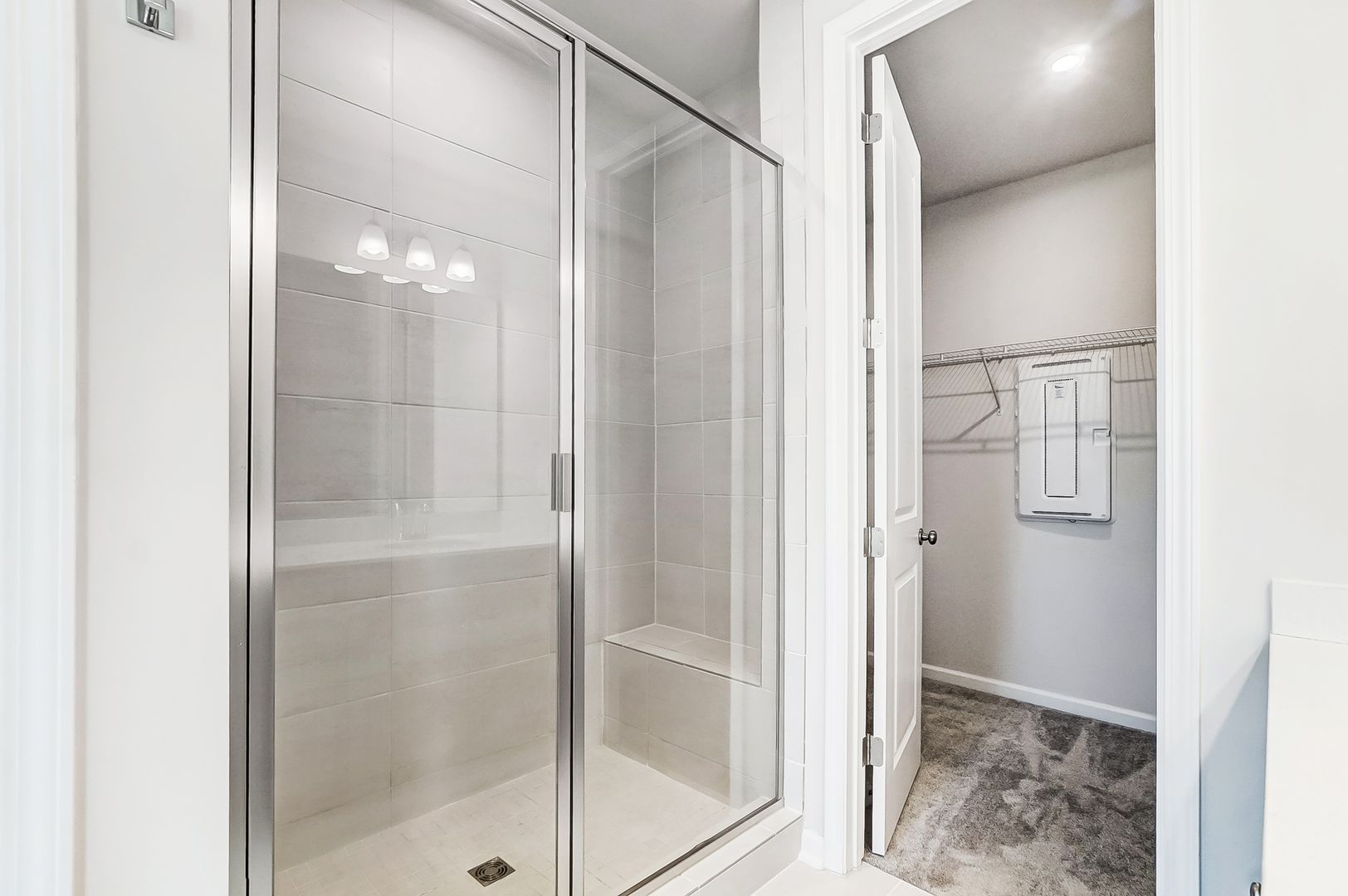 Upstairs, you’ll find a roomy hallway, a laundry area equipped with a high-end washer and dryer set, and a linen closet. The primary bedroom includes a generous walk-in closet and an ensuite bathroom with a double vanity, a shower with a seat, and floor-to-ceiling tile. The secondary bedroom also features a walk-in closet and has easy access to the full bathroom, which includes a tub/shower combo.