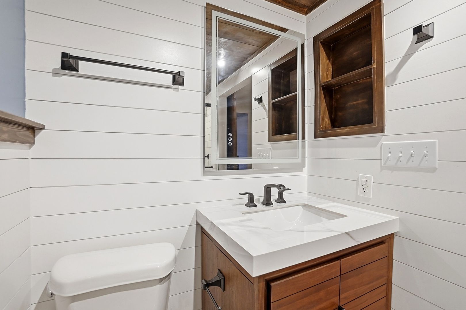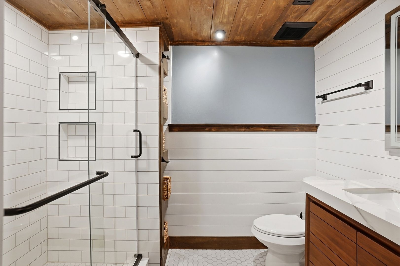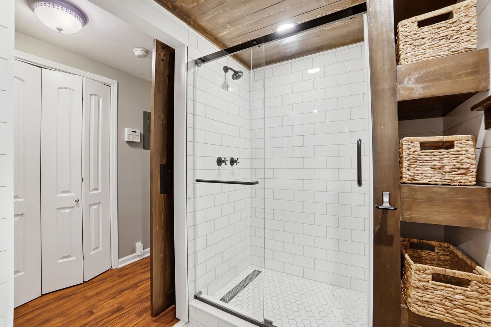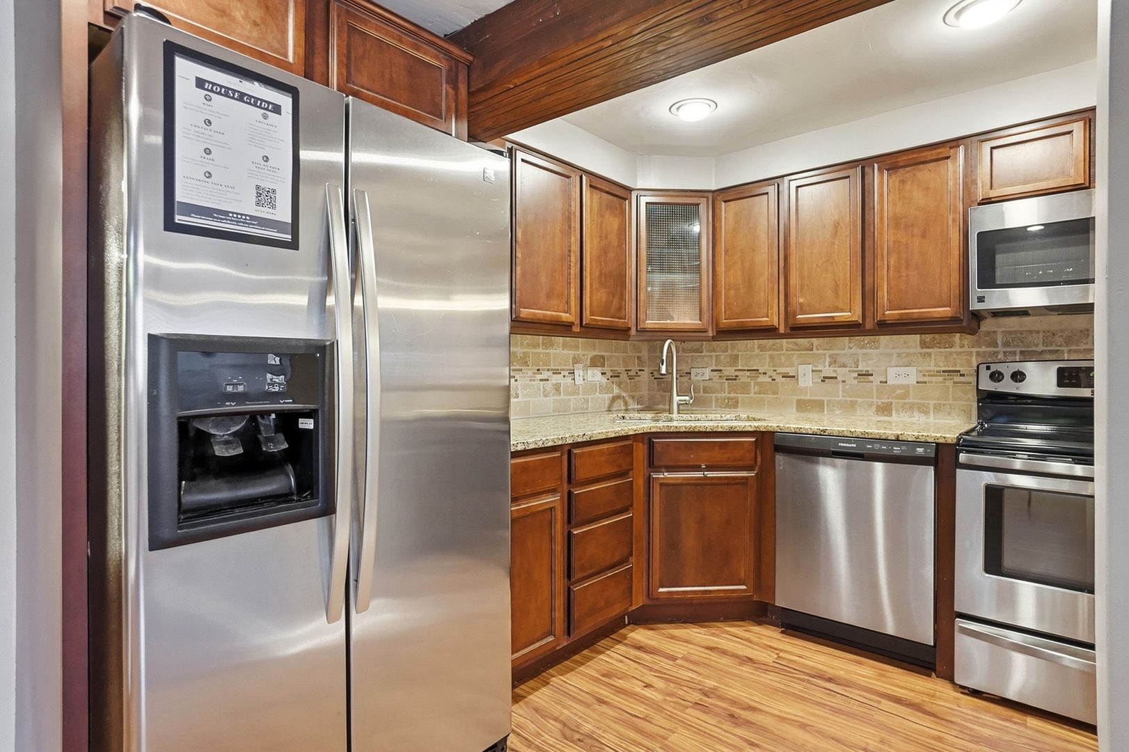 The kitchen has been tastefully updated with granite countertops, a stylish tile backsplash, and stainless steel appliances. The renovated bathroom boasts a stand-up shower with subway tile, wood beam ceilings, built-ins, and a sleek modern vanity with updated fixtures. The spacious bedroom offers two closets and ample storage.