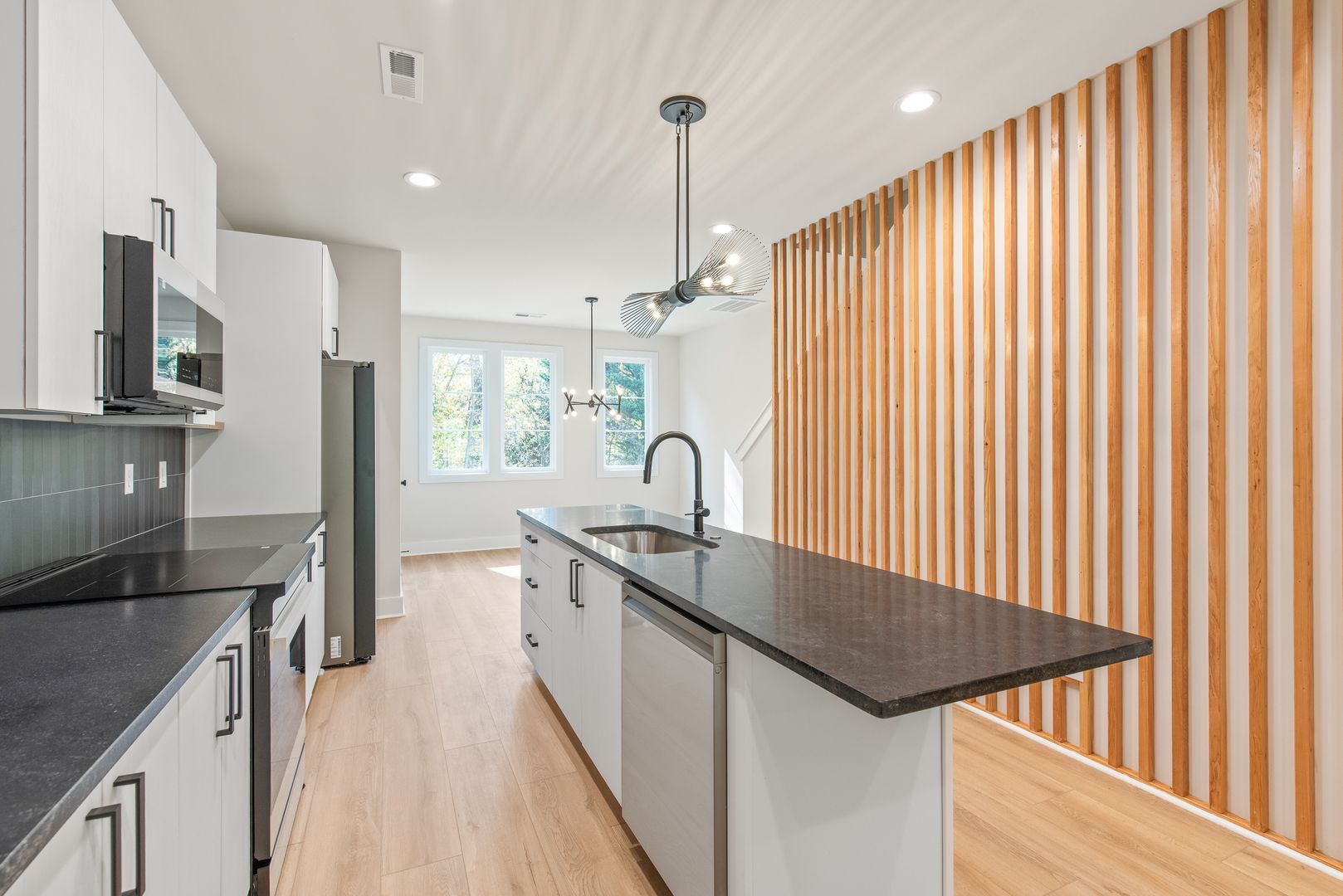 Welcome to Bishop at Briar Creek, a modern collection of thoughtfully designed townhomes in the heart of 28205. This end unit offers 1,776 sq ft of bright, open living space that balances comfort, style, and convenience. The main level features a seamless flow from the living room into the dining area and kitchen, creating an inviting space to cook, gather, and unwind. The kitchen is beautifully finished with modern appliances (including an induction stove), ample counter space, and curated lighting that elevates everyday living and entertaining.