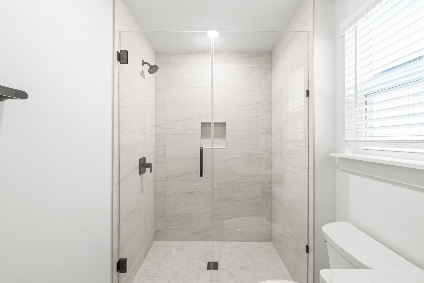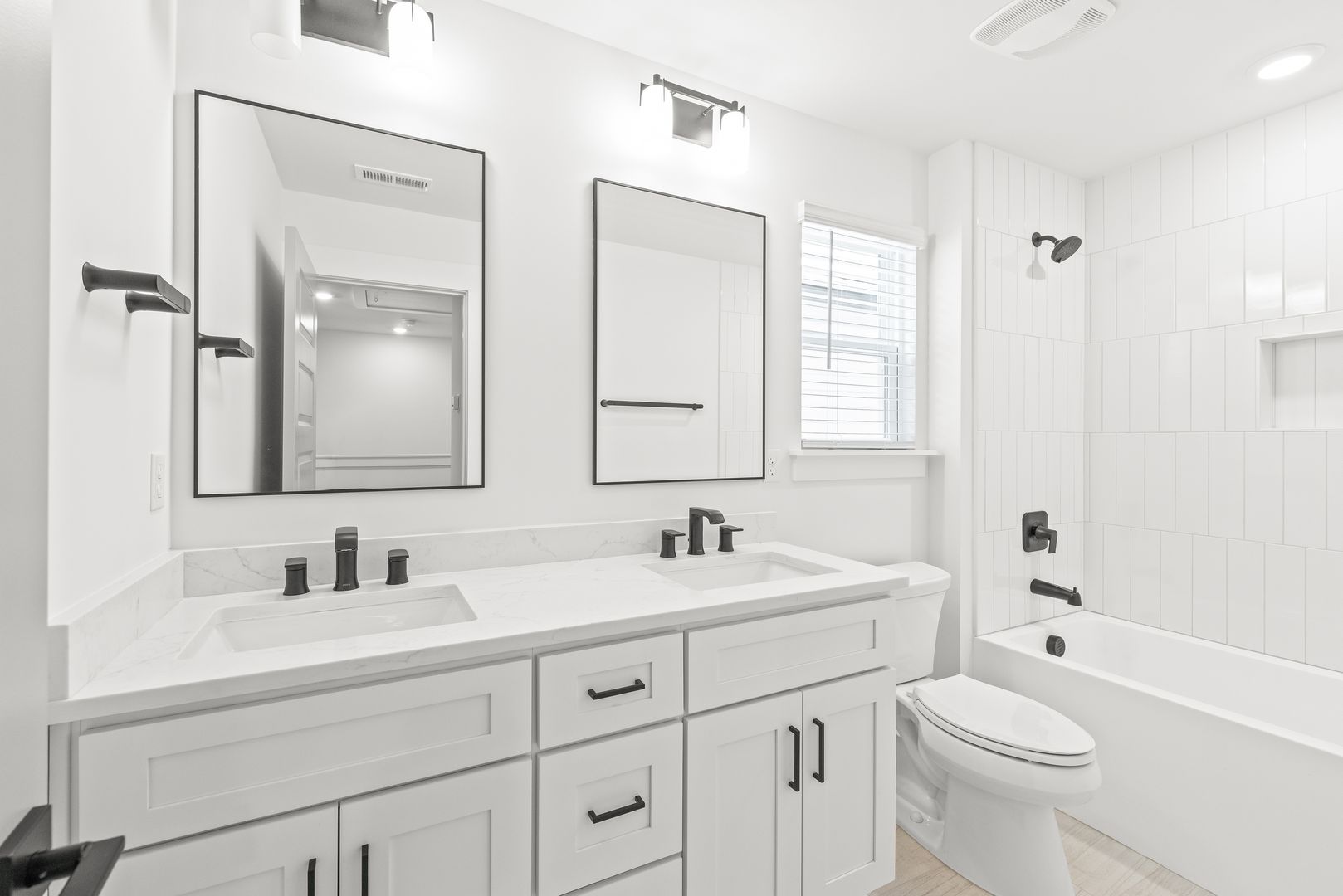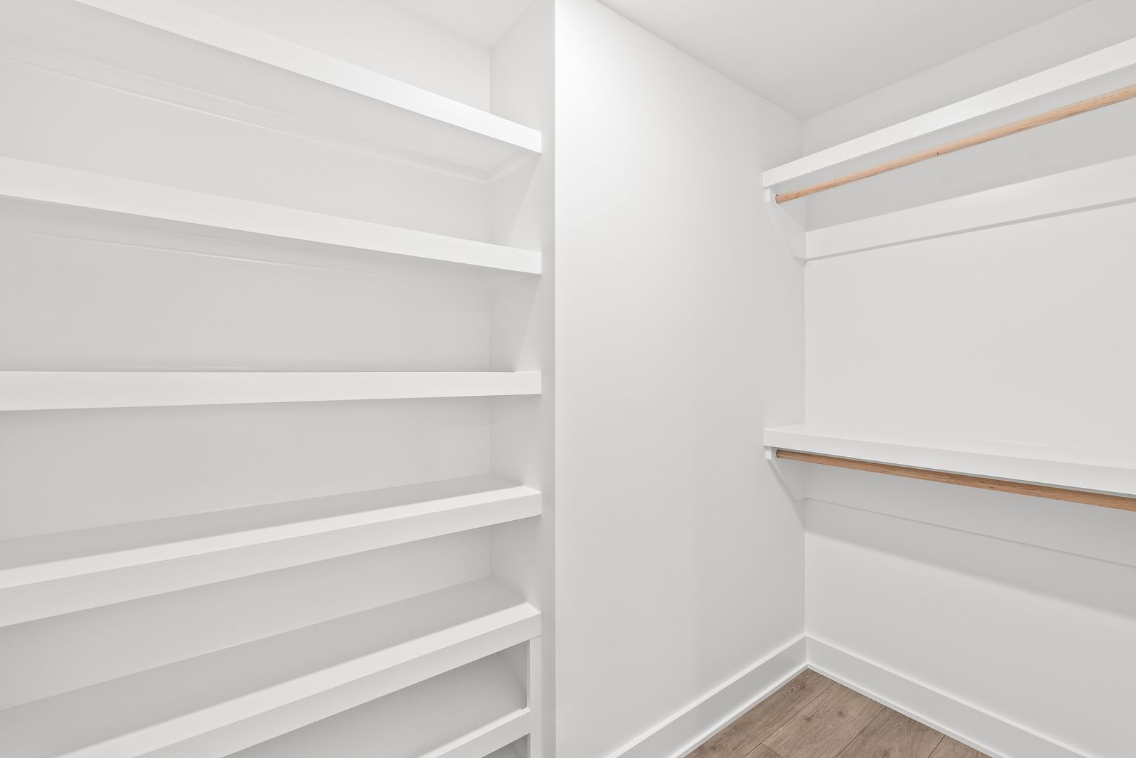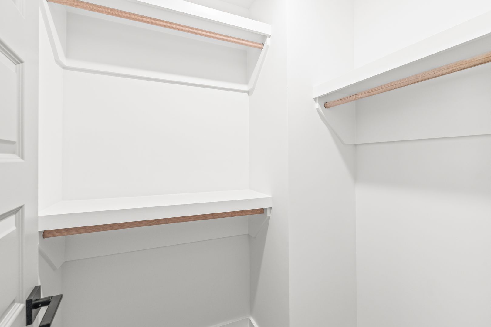Upstairs, the primary suite includes a double vanity, walk-in shower, and two walk-in closets with custom shelving. Two additional bedrooms share a full bath, and a spacious laundry room adds extra convenience.