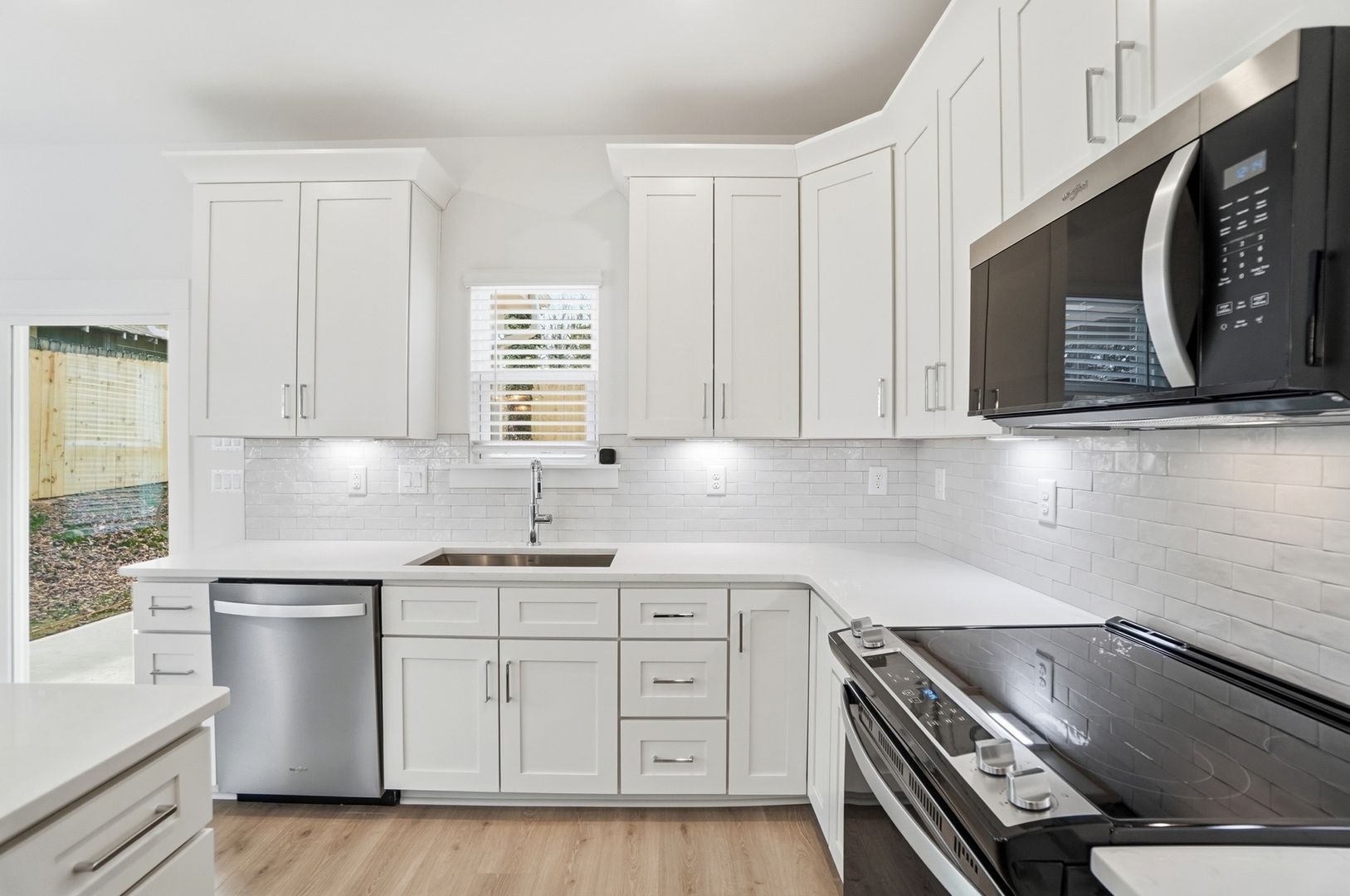 The kitchen is a true standout, featuring elegant cabinetry, sleek quartz countertops, a stylish tile backsplash, a center island, and stainless steel appliances. Every detail has been thoughtfully considered, with upgraded fixtures and finishes throughout.
