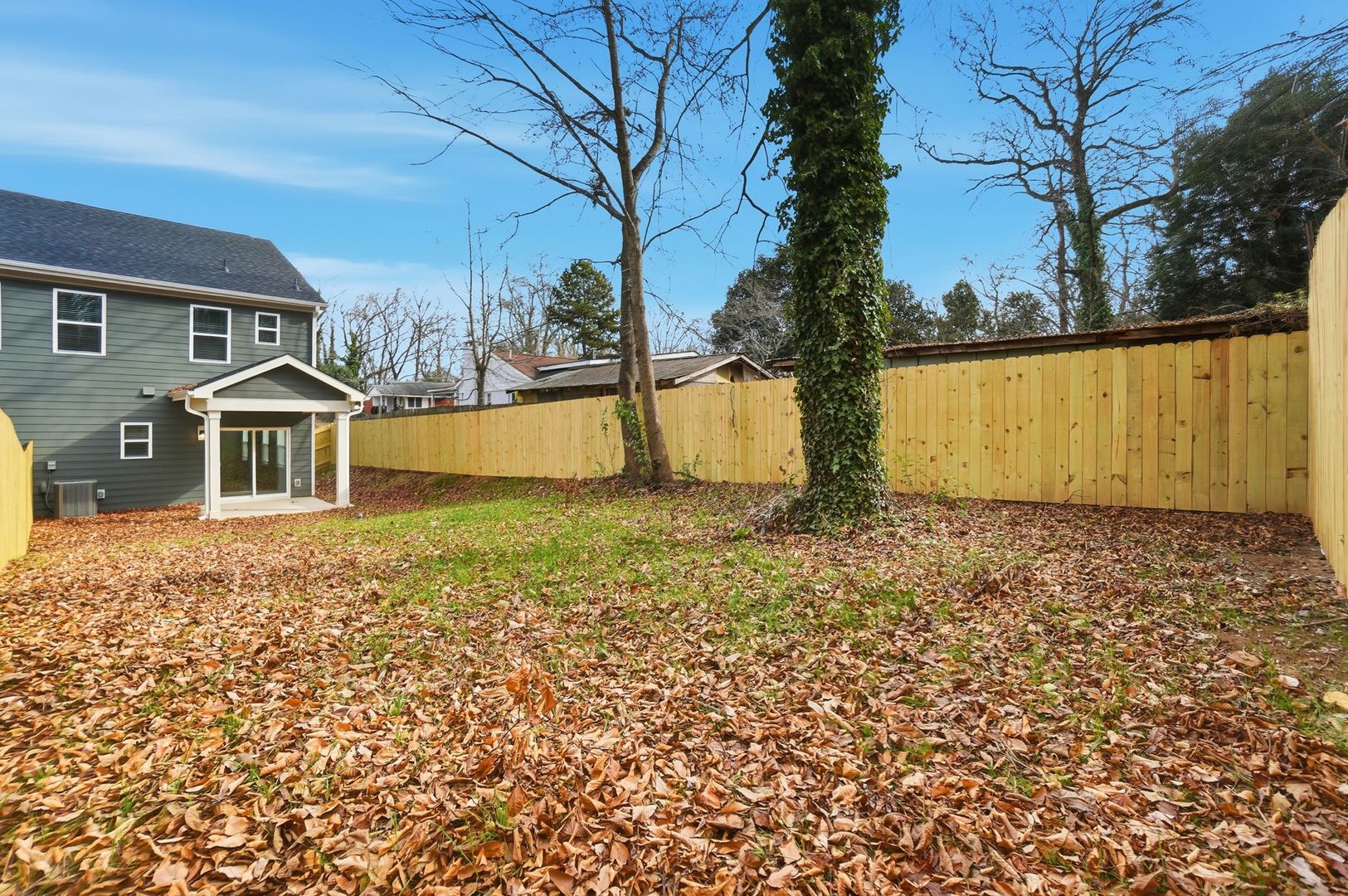 A covered back patio overlooks the expansive, fenced-in backyard, an ideal setting for outdoor relaxation, dining, or entertaining.