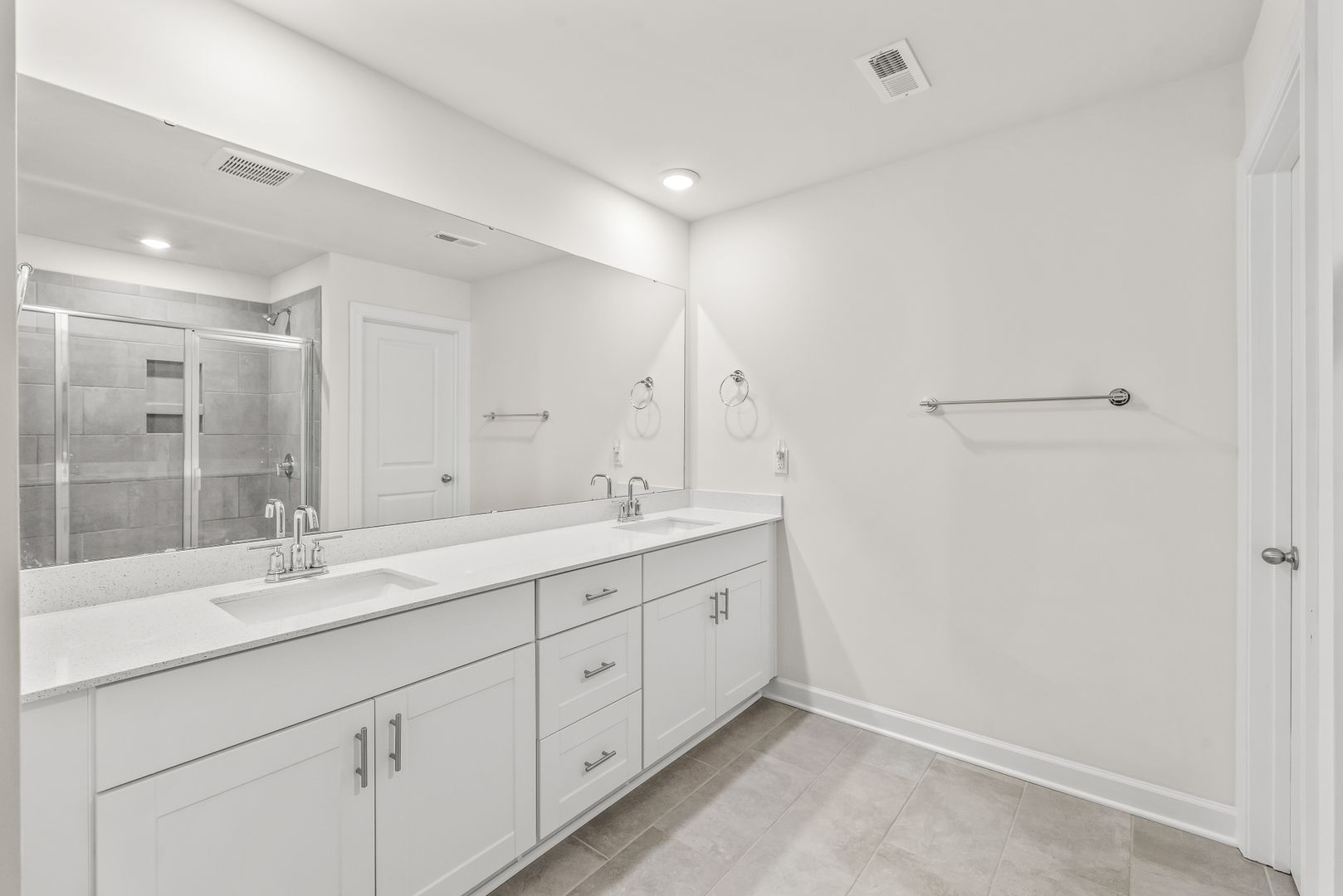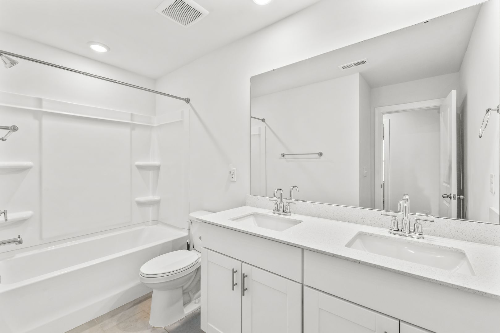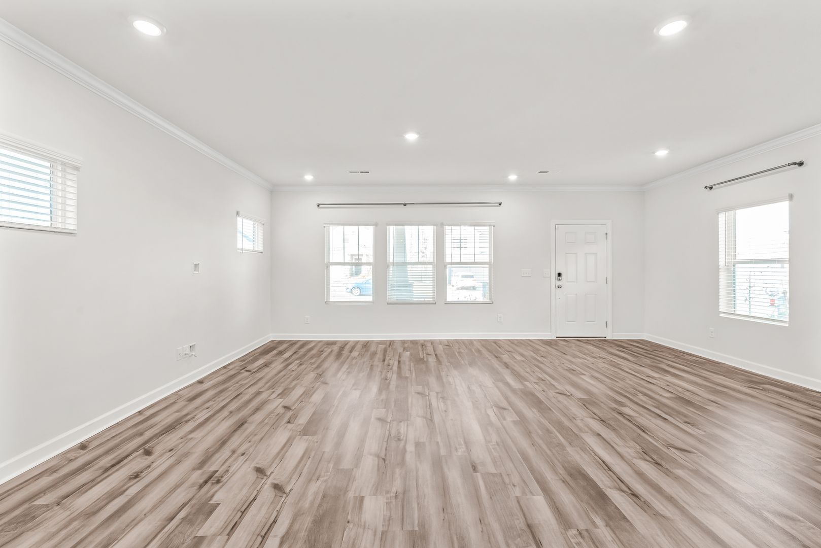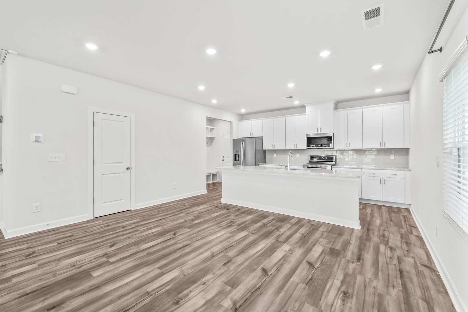 The kitchen is appointed with a large center island, stainless steel appliances, quartz countertops, and a tile backsplash, and it opens seamlessly to the spacious family room, accented with luxury vinyl plank flooring in a modern gray tone.