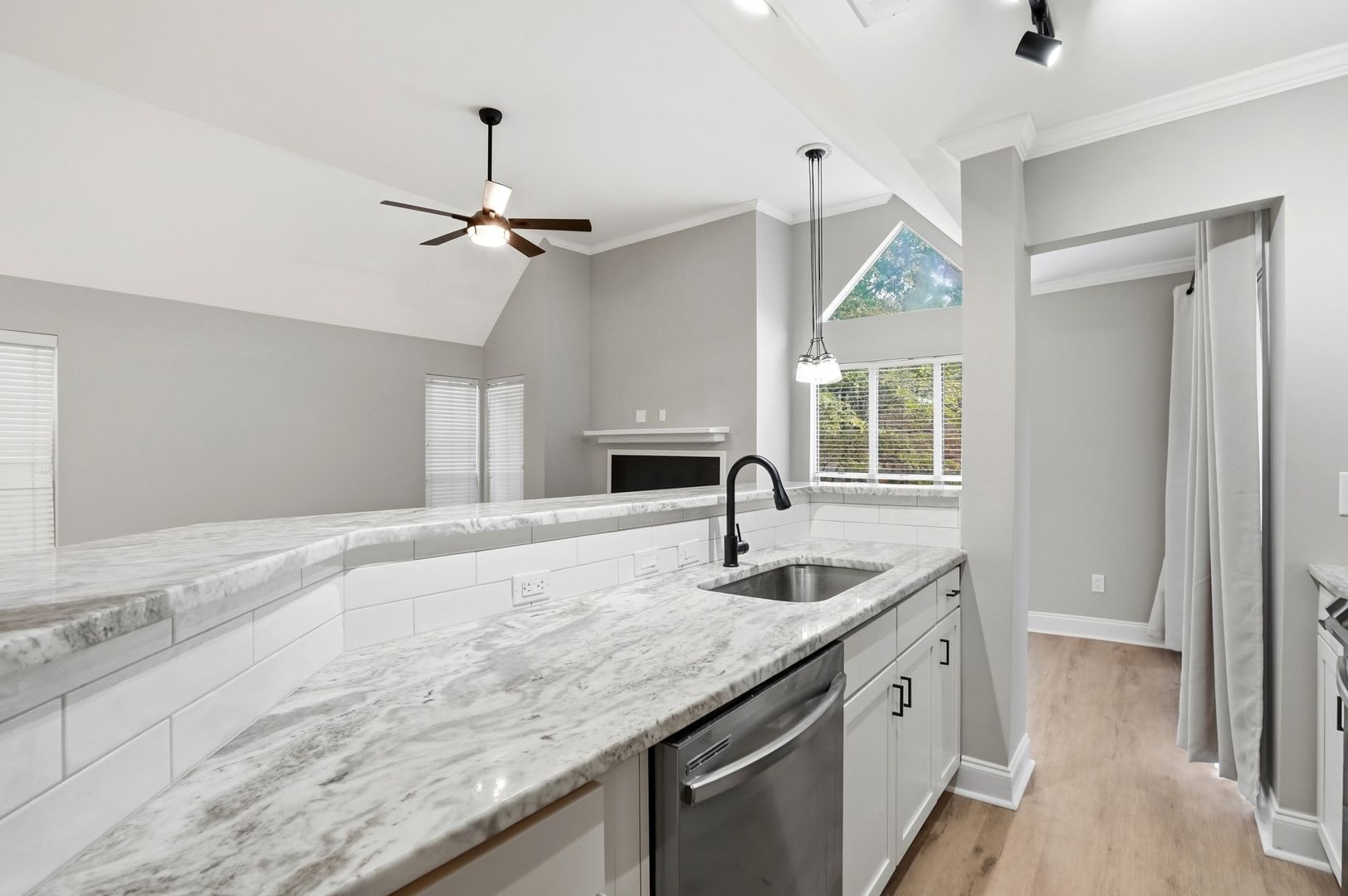 Updated and move-in ready 2 bedroom, 2 bath top floor condo with a fantastic central location convenient to Uptown, Elizabeth, Eastover, and Cotswold. This bright, open layout offers vaulted ceilings in the main living area, LVP flooring throughout, and a wood-burning fireplace as a focal point. The kitchen features white shaker cabinetry, quartz counters, tile backsplash, stainless steel appliances, and a bar-height seating area that opens to the living space. The primary bedroom includes an updated en-suite bath, ceiling fan, and direct access to the private balcony—a great spot for morning coffee or winding down in the evening. The second bedroom includes a walk-in closet with easy access to the full hall bath and laundry. This community is close to The Mint Museum, Laurel Market, Summit Coffee, parks, shops, and restaurants throughout Elizabeth.