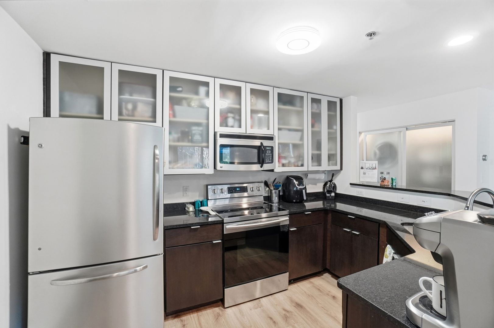 The kitchen is appointed with granite countertops, stainless steel appliances, and a breakfast bar—perfect for entertaining. Abundant natural light enhances the condo throughout. The private owner’s retreat includes a walk-in closet and an ensuite bath.
